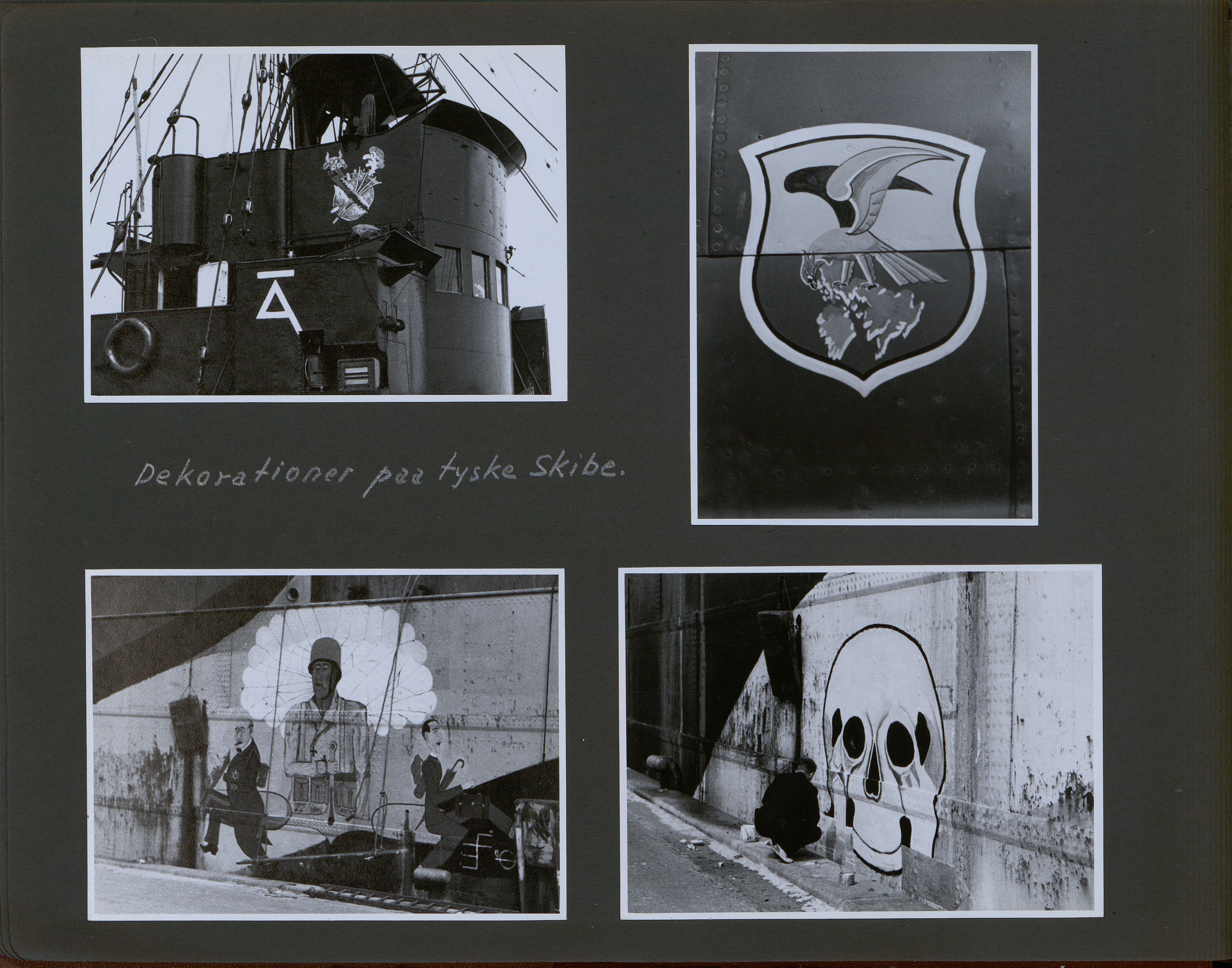 Enkeltside fra fotoalbum der har tilhørt fotohandler Jens Christian Høeg fra Randers. Indeholder mest ikke-originale fotos fra 1940-41 bl.a. med: minesprængte skibe, Lufwaffe enheder og antiluftskyts, Alsang, bomberydning, spildindsamling samt nedskudte tyske fly m.m.