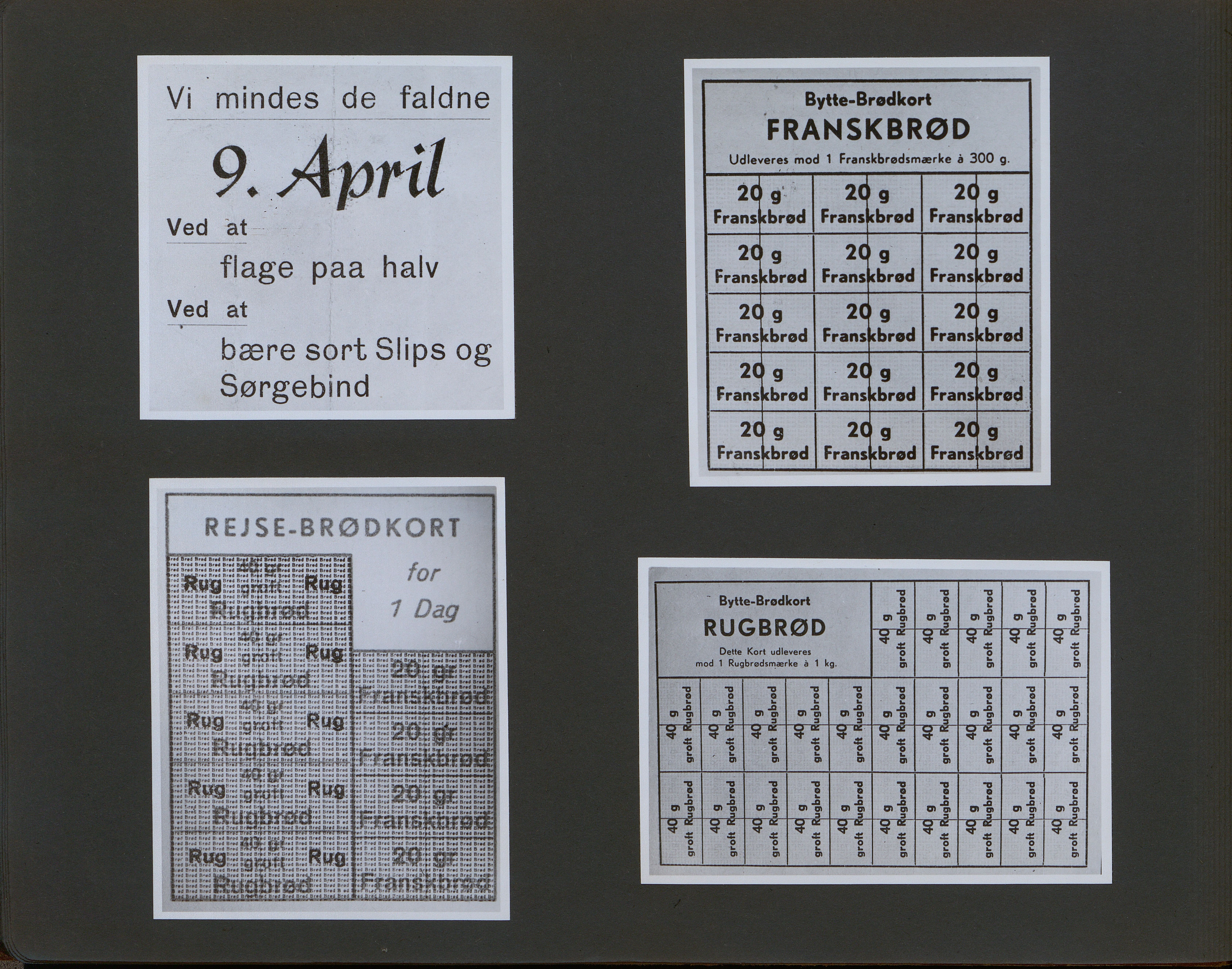 Enkeltside fra fotoalbum der har tilhørt fotohandler Jens Christian Høeg fra Randers. Indeholder mest ikke-originale fotos fra 1940-41 bl.a. med: minesprængte skibe, Lufwaffe enheder og antiluftskyts, Alsang, bomberydning, spildindsamling samt nedskudte tyske fly m.m.