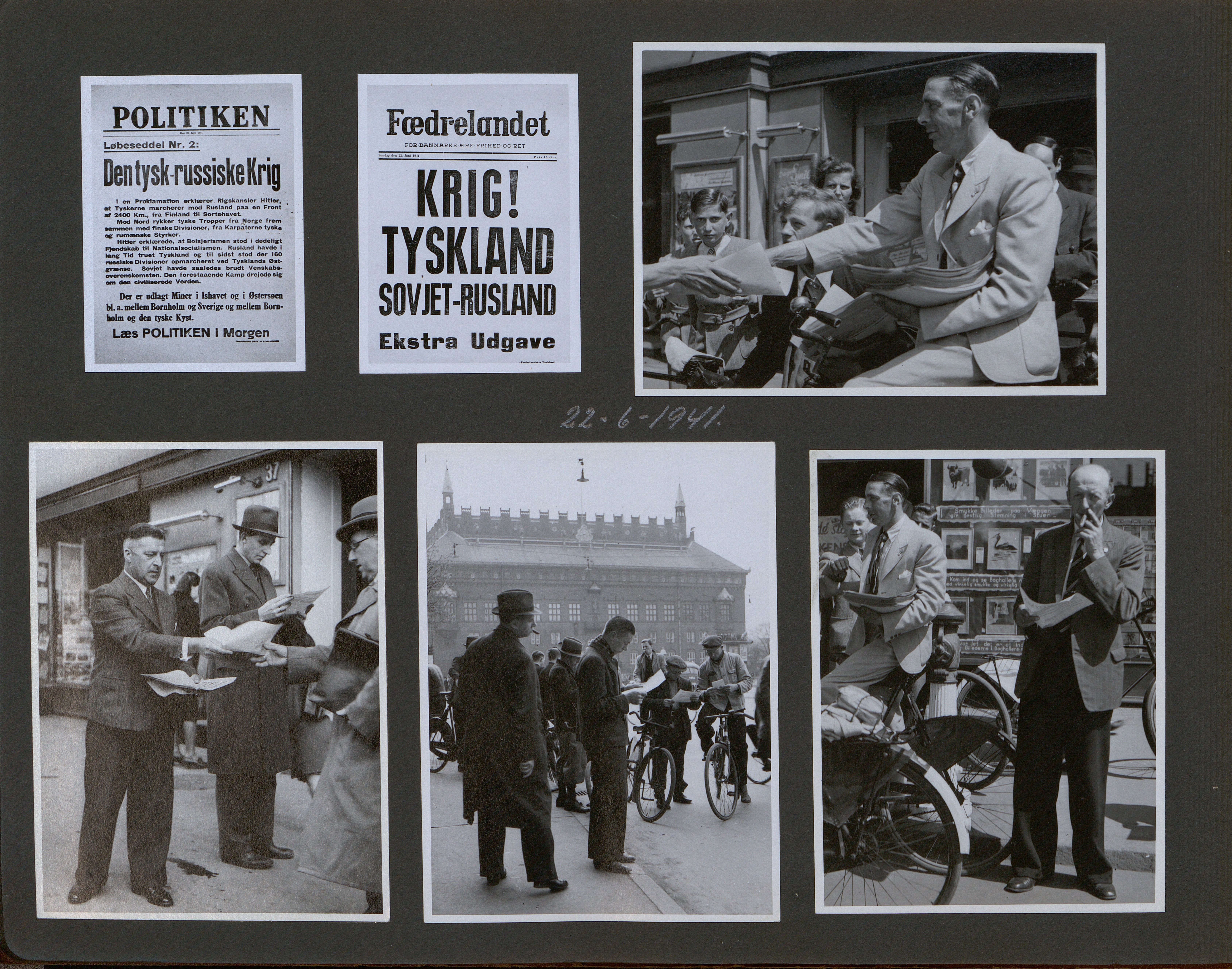 Enkeltside fra fotoalbum der har tilhørt fotohandler Jens Christian Høeg fra Randers. Indeholder mest ikke-originale fotos fra 1940-41 bl.a. med: minesprængte skibe, Lufwaffe enheder og antiluftskyts, Alsang, bomberydning, spildindsamling samt nedskudte tyske fly m.m.