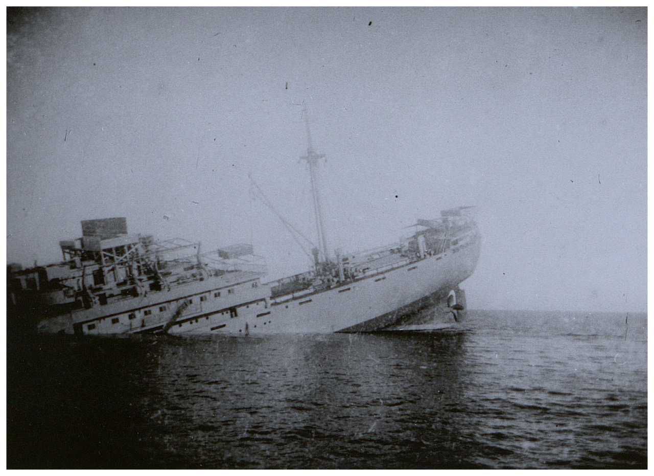 Enkeltfoto fra fotoalbum der har tilhørt fotohandler Jens Christian Høeg fra Randers. Indeholder mest ikke-originale fotos fra 1940-41 bl.a. med: minesprængte skibe, Lufwaffe enheder og antiluftskyts, Alsang, bomberydning, spildindsamling samt nedskudte tyske fly m.m.