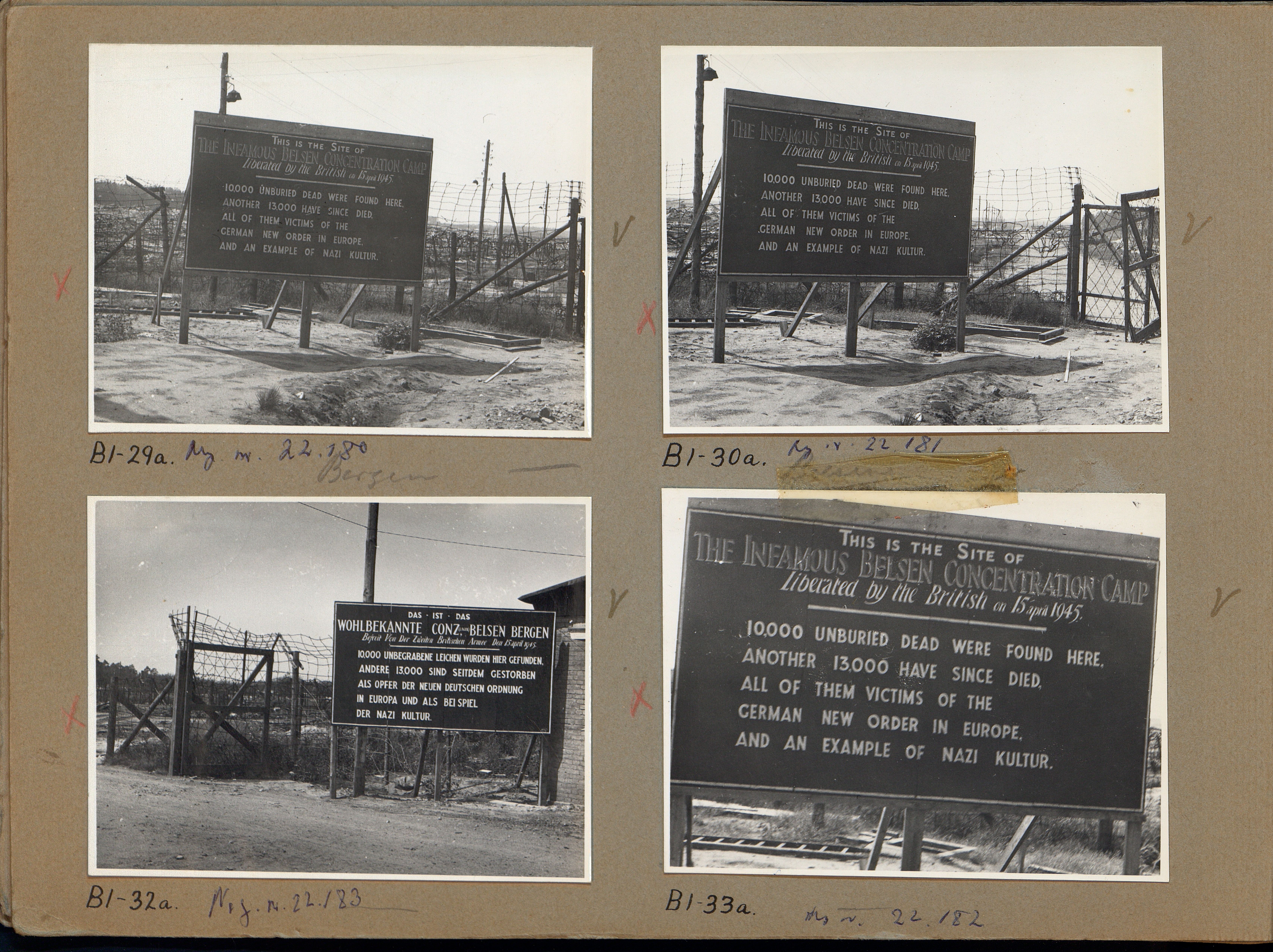 Enkeltside fra fotoalbum i to bind med fotos fra KZ-lejrene i Bergen-Belsen og Schandelah efter befrielsen.
