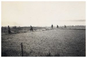 Enkeltfoto fra fotoalbum med titlen "Fotoreportage fra kampen om Mors", der viser Hjemmeværnsøvelse mellem 1946 og 1952, i Hjemmeværnsregion II, Viborg. Indeholder liste bagi med navne på bestillere og bestilte numre. Fotograferet af M. Amby fra Roslev.
