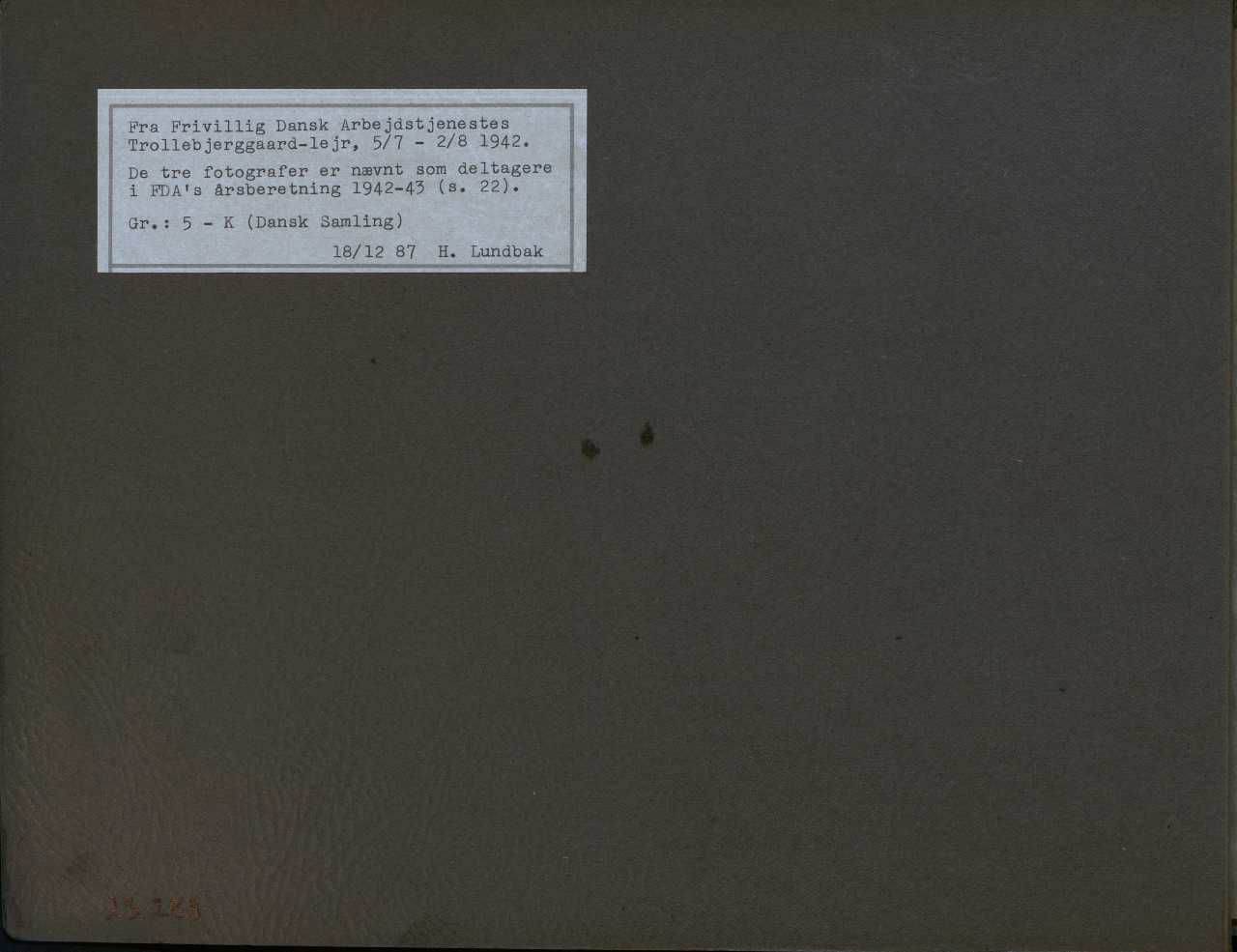 Enkeltside fra album med fotos fra Frivillig Dansk Arbejdstjenestes (Dansk Samling) Trollebjerggaardlejr i perioden 05.07.-02.08.1942. Fotos taget af 3 deltagere, der er nævnt i FDA's årberetning 1942-1943, s.22.