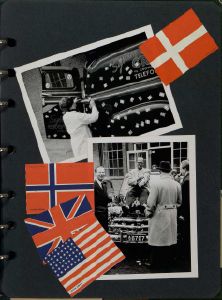 Enkeltside fra album med 15 indklæbede fotos og 12 løse samt 5 siders udklip. Vedrører 10 års jubilæet for Danmarks befrielse.