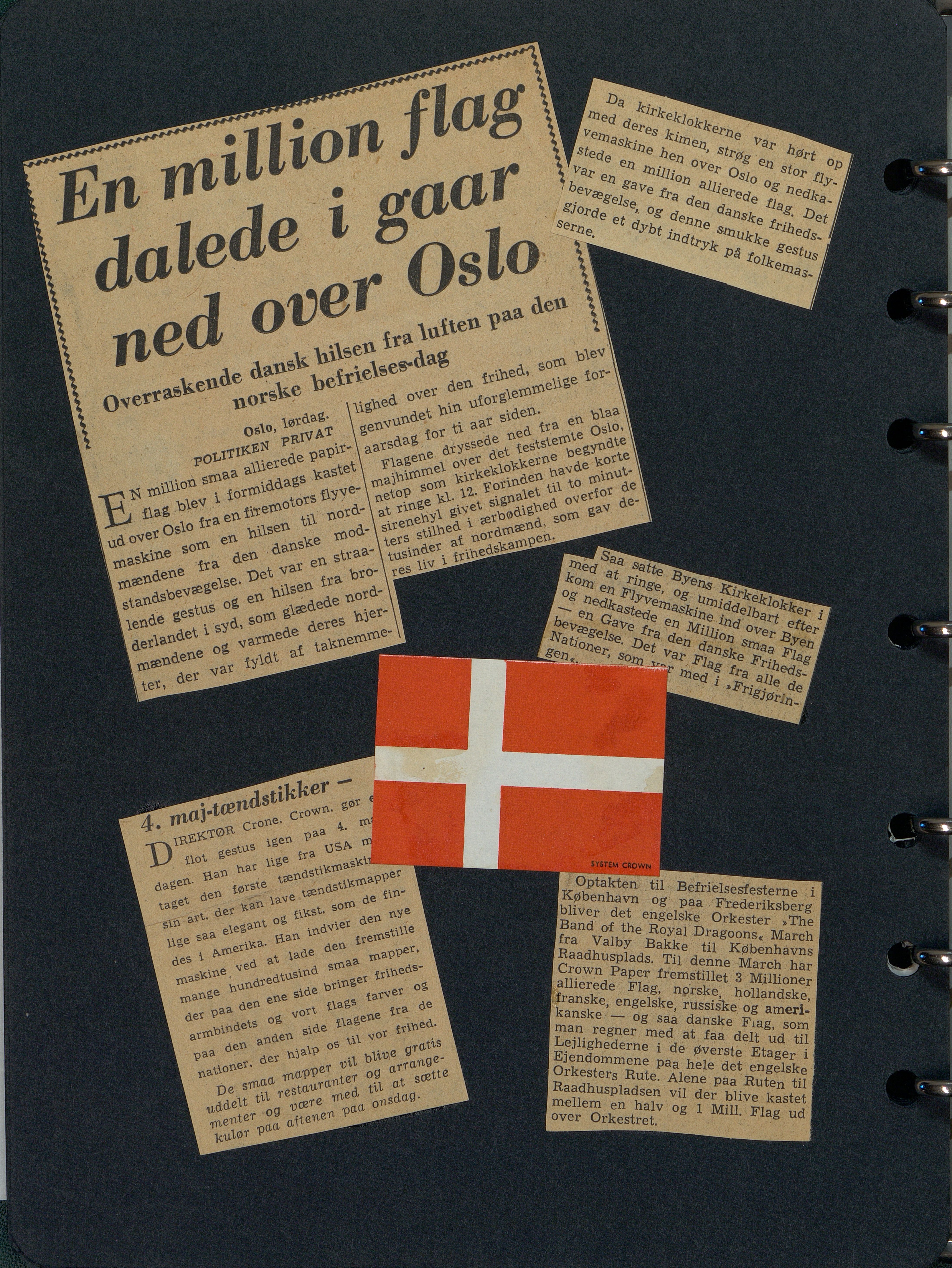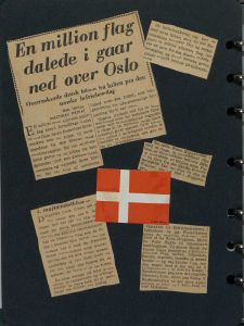 Enkeltside fra album med 15 indklæbede fotos og 12 løse samt 5 siders udklip. Vedrører 10 års jubilæet for Danmarks befrielse.