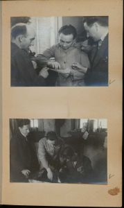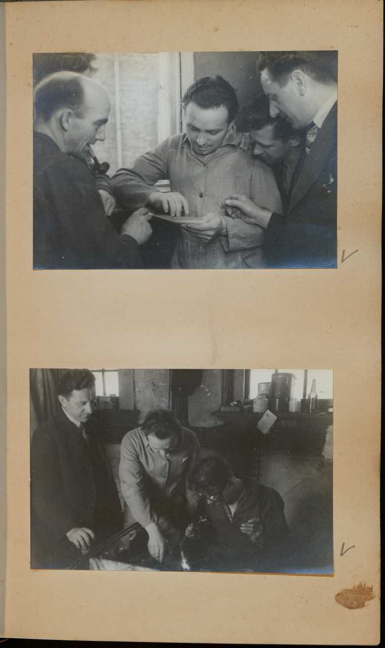 Enkeltside fra fotoalbum vedr. modstandskompagniet P.6., med rekonstruerede situationer vedr. sabotager, våbenfabrikation m.m. Dertil en del portrætter.