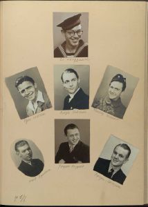 Enkeltside fra album for Stabskompagniet ved Sydhavnsbataillonen (Dansk Borgerværn). Gave til kompagnichefen Carl Stripp ved hjemsendelsen. Fortegner medlemmerne gruppe for gruppe. Med gruppe- og portrætfotos, i en del tilfælde dog uden personidentifikation.