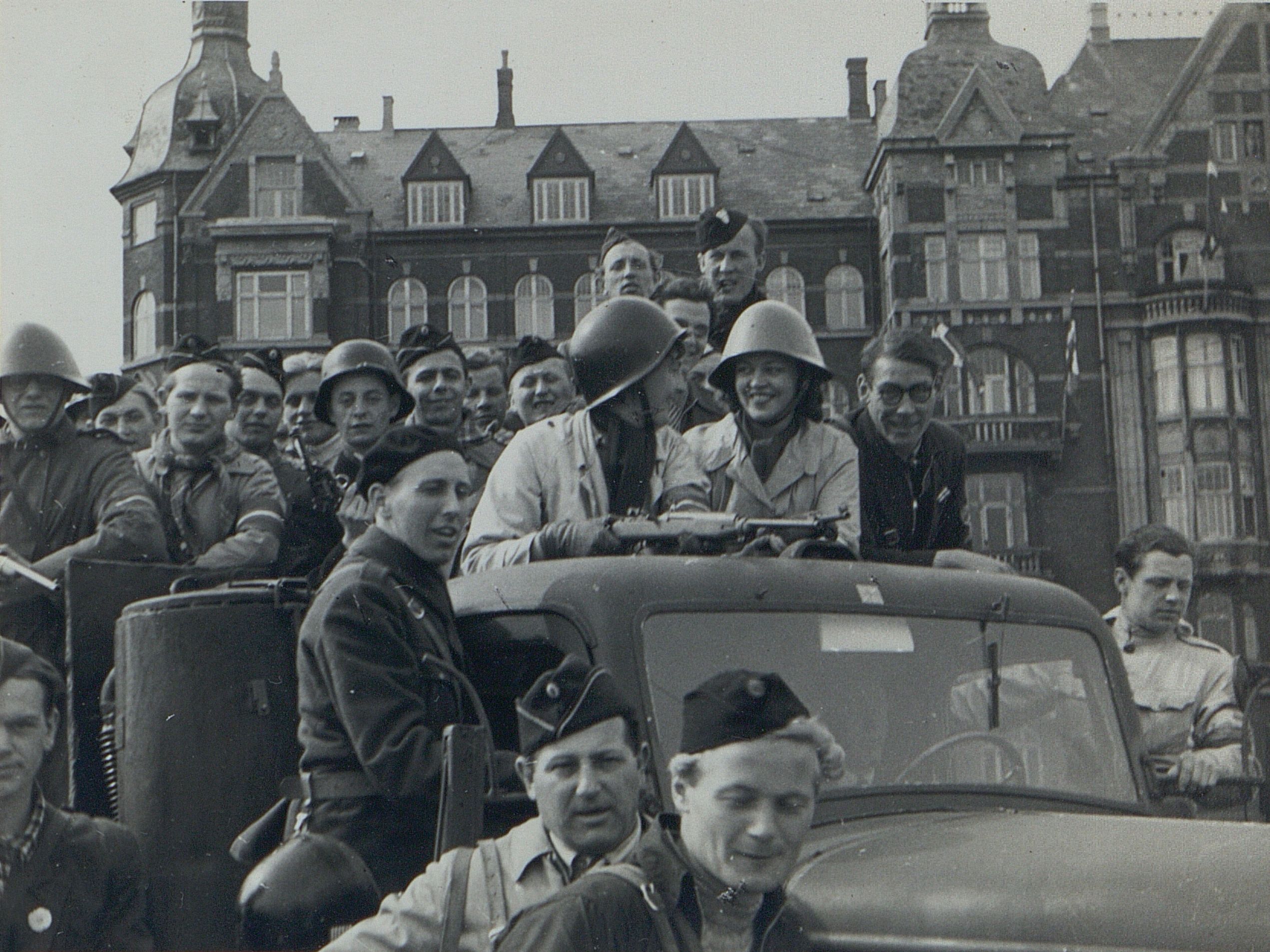 Enkeltfoto fra album for Stabskompagniet ved Sydhavnsbataillonen (Dansk Borgerværn). Gave til kompagnichefen Carl Stripp ved hjemsendelsen. Fortegner medlemmerne gruppe for gruppe. Med gruppe- og portrætfotos, i en del tilfælde dog uden personidentifikation.