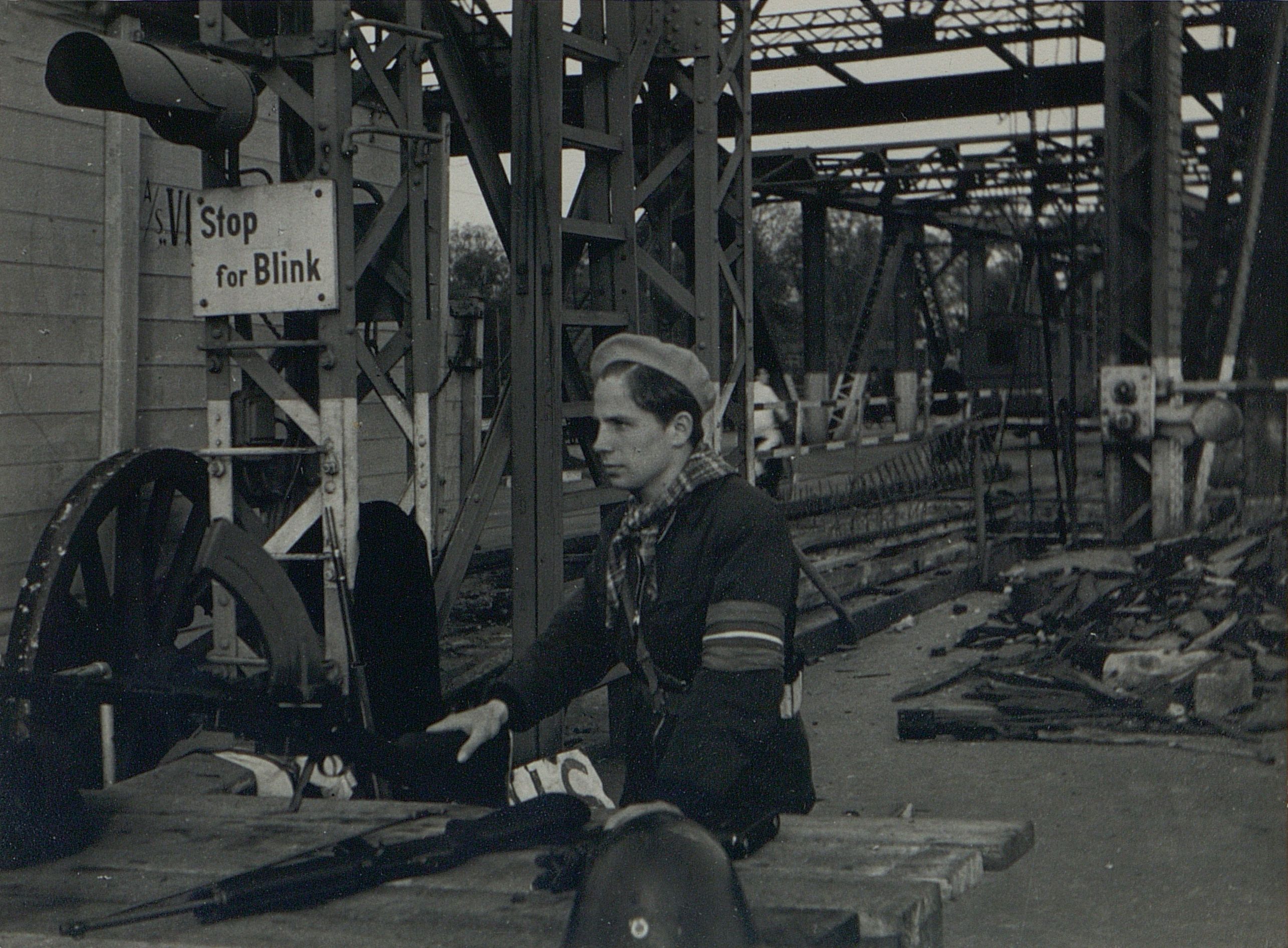 Enkeltfoto fra album for Stabskompagniet ved Sydhavnsbataillonen (Dansk Borgerværn). Gave til kompagnichefen Carl Stripp ved hjemsendelsen. Fortegner medlemmerne gruppe for gruppe. Med gruppe- og portrætfotos, i en del tilfælde dog uden personidentifikation.