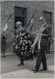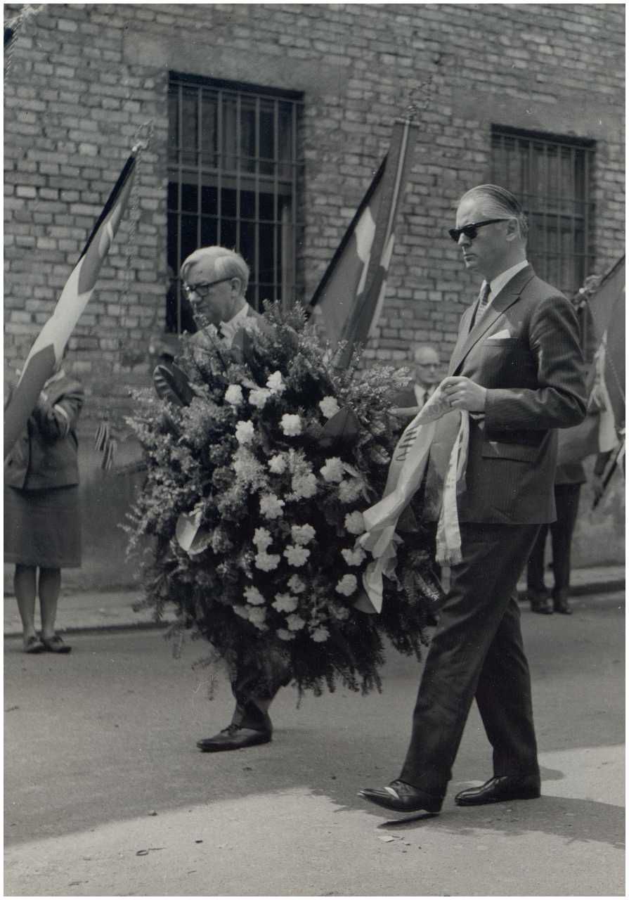 Enkeltfoto fra fotoalbum med fotos fra en mindetur til Polen arrangeret af foreningen"Gestapofangerne". Krandsenedlæggelse i Warszawa og besøg i Frihedsmuseets udstilling i Auschwitz. Frihedsmuseets leder Aage Roussell ses.