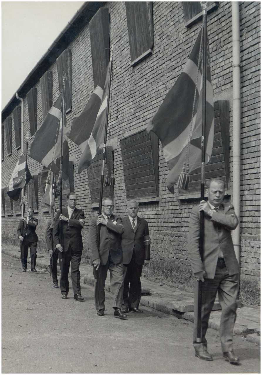 Enkeltfoto fra fotoalbum med fotos fra en mindetur til Polen arrangeret af foreningen"Gestapofangerne". Krandsenedlæggelse i Warszawa og besøg i Frihedsmuseets udstilling i Auschwitz. Frihedsmuseets leder Aage Roussell ses.