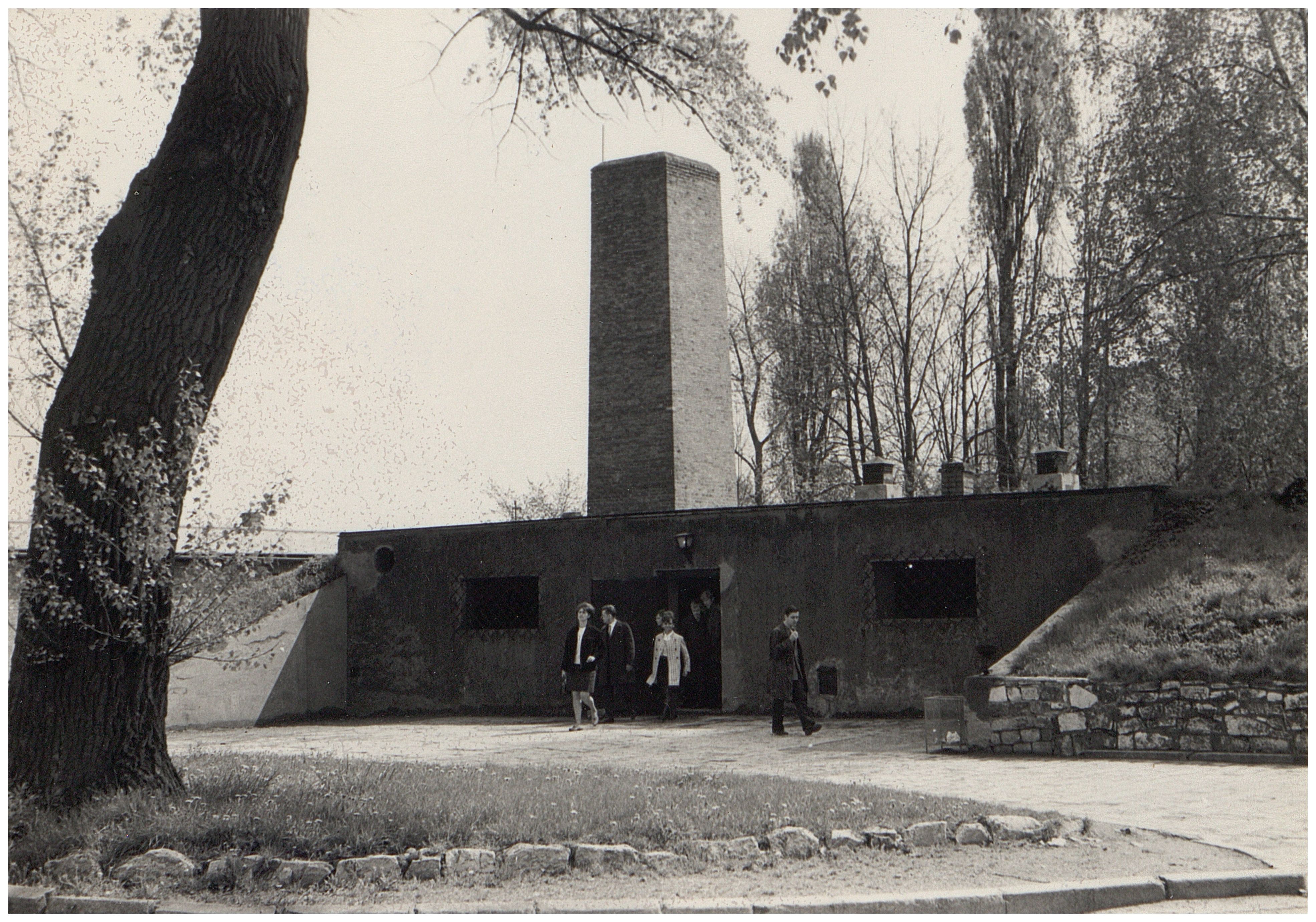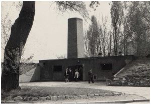 Enkeltfoto fra fotoalbum med fotos fra en mindetur til Polen arrangeret af foreningen"Gestapofangerne". Krandsenedlæggelse i Warszawa og besøg i Frihedsmuseets udstilling i Auschwitz. Frihedsmuseets leder Aage Roussell ses.