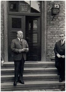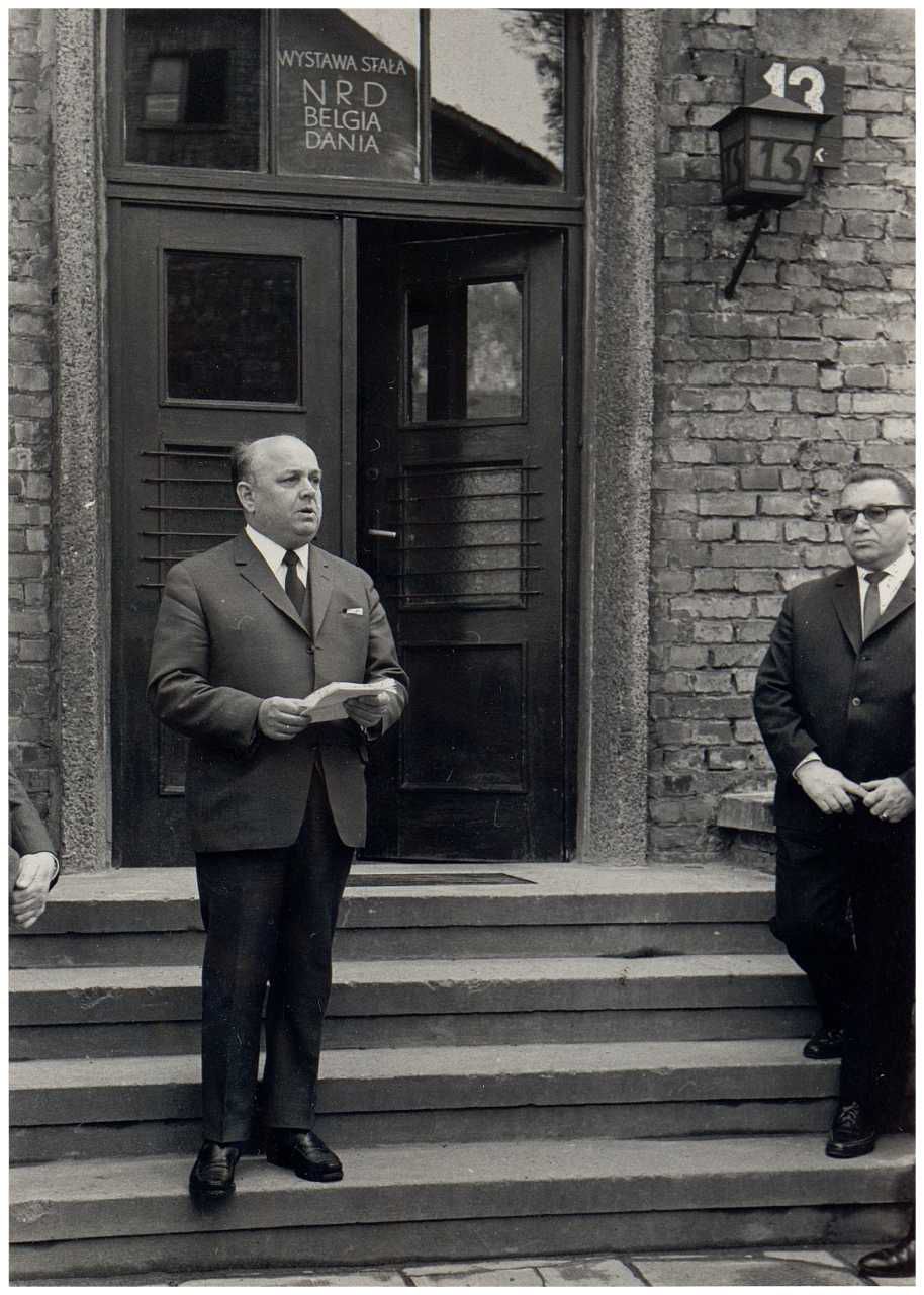 Enkeltfoto fra fotoalbum med fotos fra en mindetur til Polen arrangeret af foreningen"Gestapofangerne". Krandsenedlæggelse i Warszawa og besøg i Frihedsmuseets udstilling i Auschwitz. Frihedsmuseets leder Aage Roussell ses.
