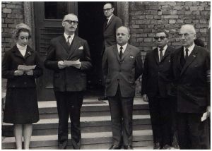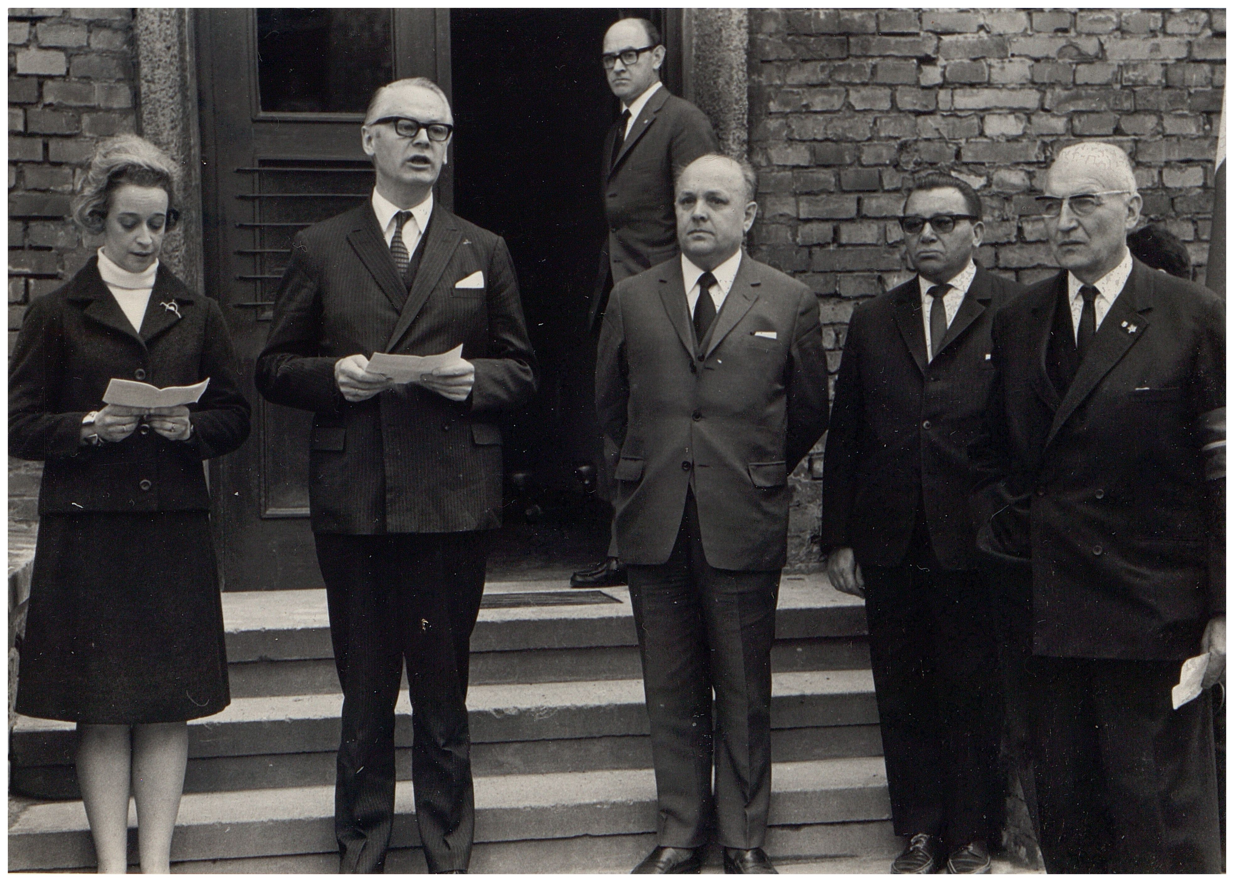 Enkeltfoto fra fotoalbum med fotos fra en mindetur til Polen arrangeret af foreningen"Gestapofangerne". Krandsenedlæggelse i Warszawa og besøg i Frihedsmuseets udstilling i Auschwitz. Frihedsmuseets leder Aage Roussell ses.