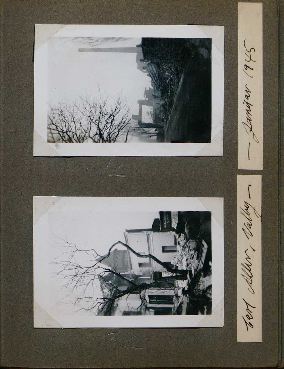 Enkeltside fra album med blandede fotos fra tiden juni 1944 til april 1945. Bl.a. fra Folkestrejken, angrebet på Shellhuset, nedstyrtet Spitfire på Øster Allé fra den 21.03 1945, diverse schalburgtager, udbringning af post i hestevogn m.m.