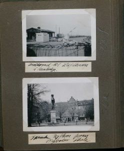 Enkeltside fra album med blandede fotos fra tiden juni 1944 til april 1945. Bl.a. fra Folkestrejken, angrebet på Shellhuset, nedstyrtet Spitfire på Øster Allé fra den 21.03 1945, diverse schalburgtager, udbringning af post i hestevogn m.m.