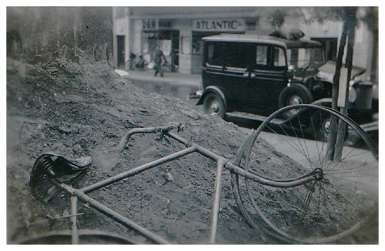 Enkeltfoto fra album med blandede fotos fra tiden juni 1944 til april 1945. Bl.a. fra Folkestrejken, angrebet på Shellhuset, nedstyrtet Spitfire på Øster Allé fra den 21.03 1945, diverse schalburgtager, udbringning af post i hestevogn m.m.