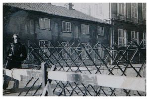 Enkeltfoto fra album med blandede fotos fra tiden juni 1944 til april 1945. Bl.a. fra Folkestrejken, angrebet på Shellhuset, nedstyrtet Spitfire på Øster Allé fra den 21.03 1945, diverse schalburgtager, udbringning af post i hestevogn m.m.