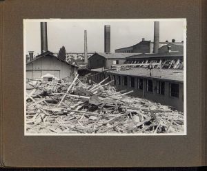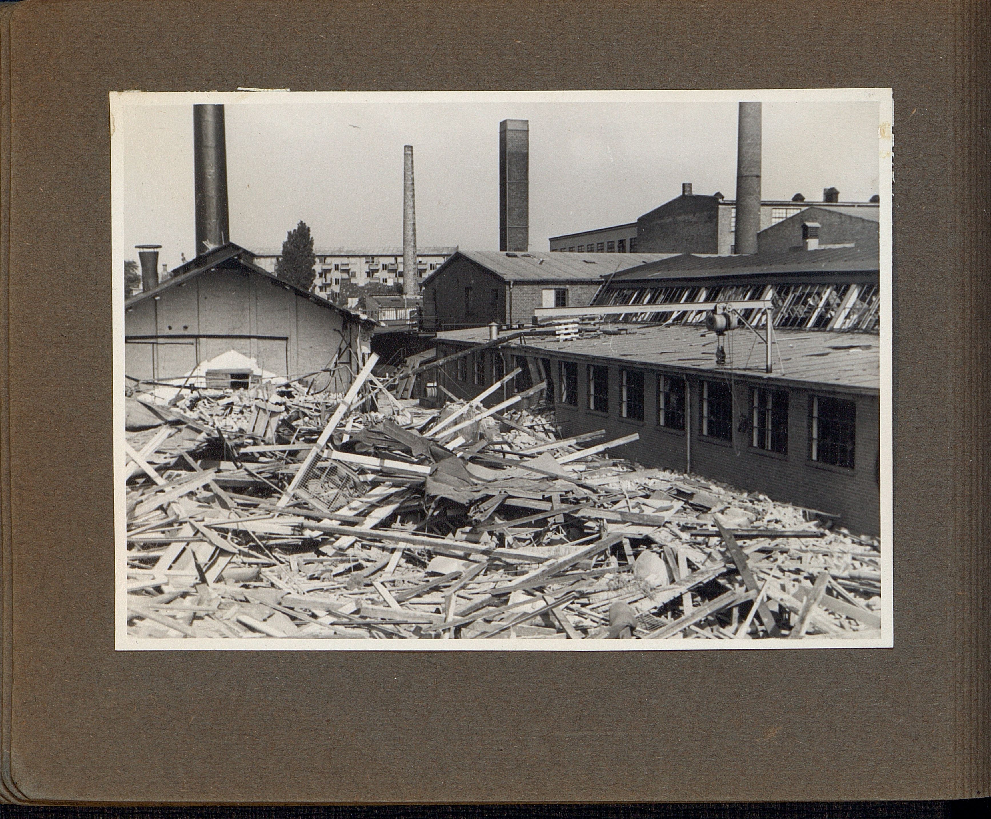 Enkeltside fra fotoalbum med titlen: "Krigskatastrofer paa Dansk Aluminiums Industri A/S". Viser fotos fra 3 sabotager fra henholdsvis 19.02-20.02.1943 (KOPA), 30.06.1944 (BOPA) og 17.01.1945 (BOPA).