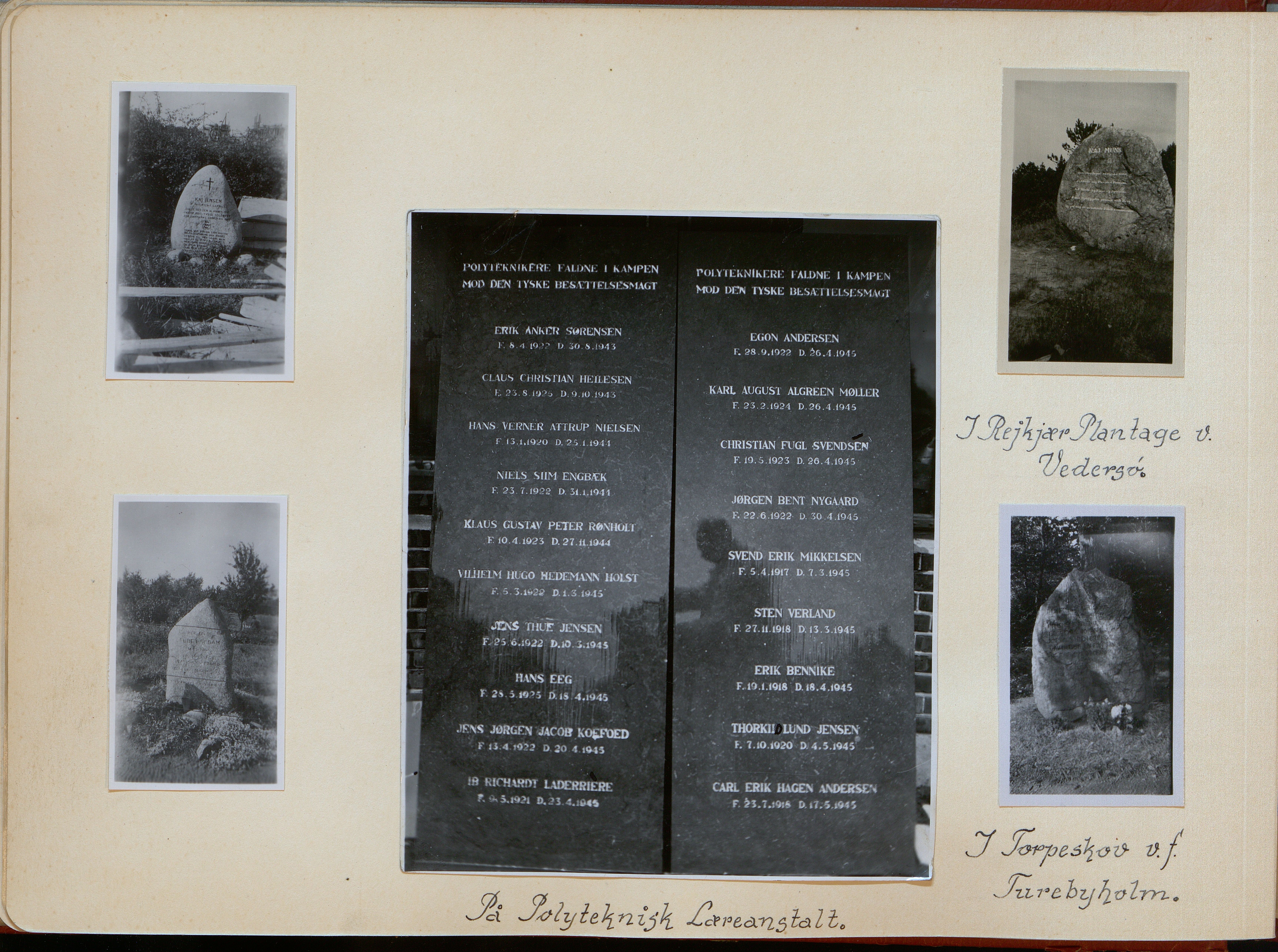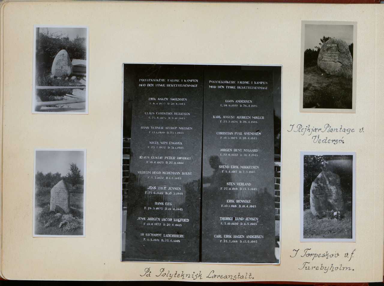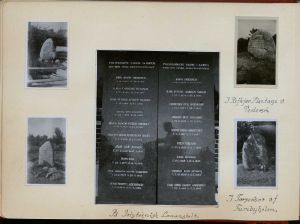Enkeltside fra mindealbum på 29 sider med fotos og tekster af mindesten og mindetavler m.m. Tekster og fotos samlet af major Kølving.