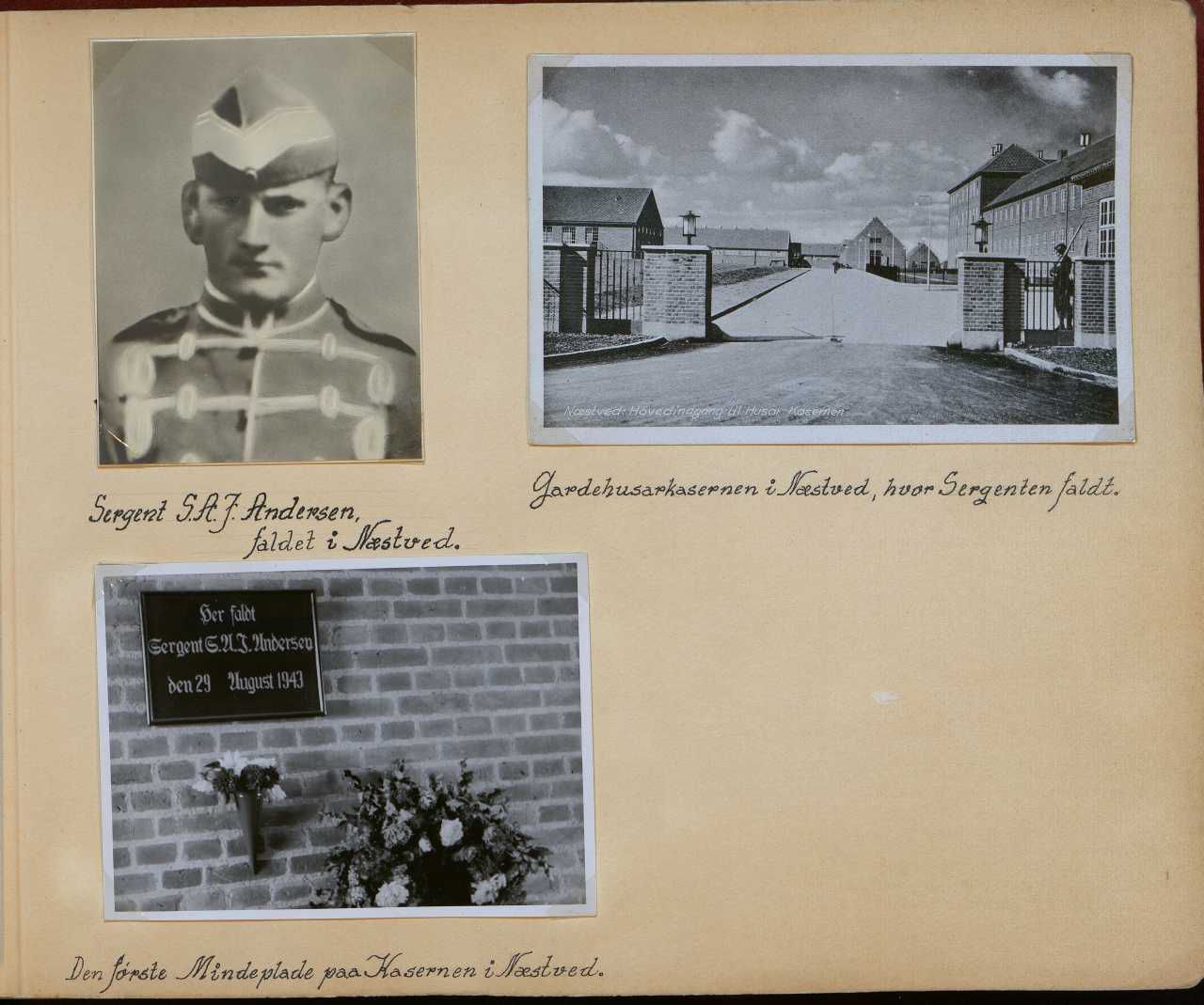 Enkeltside fra mindealbum med 35 sider fotos og tekster omhandlende de faldne og sårede soldater fra den 29.08.1943. Viser portrætter, grave og mindesteder m.m. Fotos og tekster samlet af major Kølving.