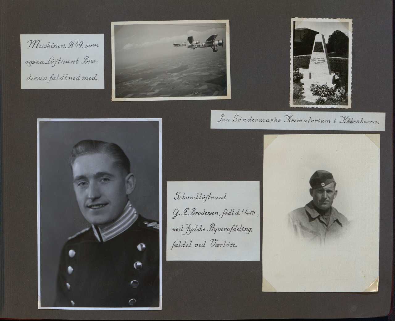 Enkeltside fra mindealbum med 35 sider fotos og tekster omhandlende de faldne fra den 9. april 1940. Viser portrætter, grave, mindesteder, fly, ødelagte våben m.m. Fotos og tekster samlet af major Kølving.