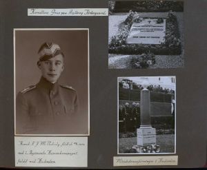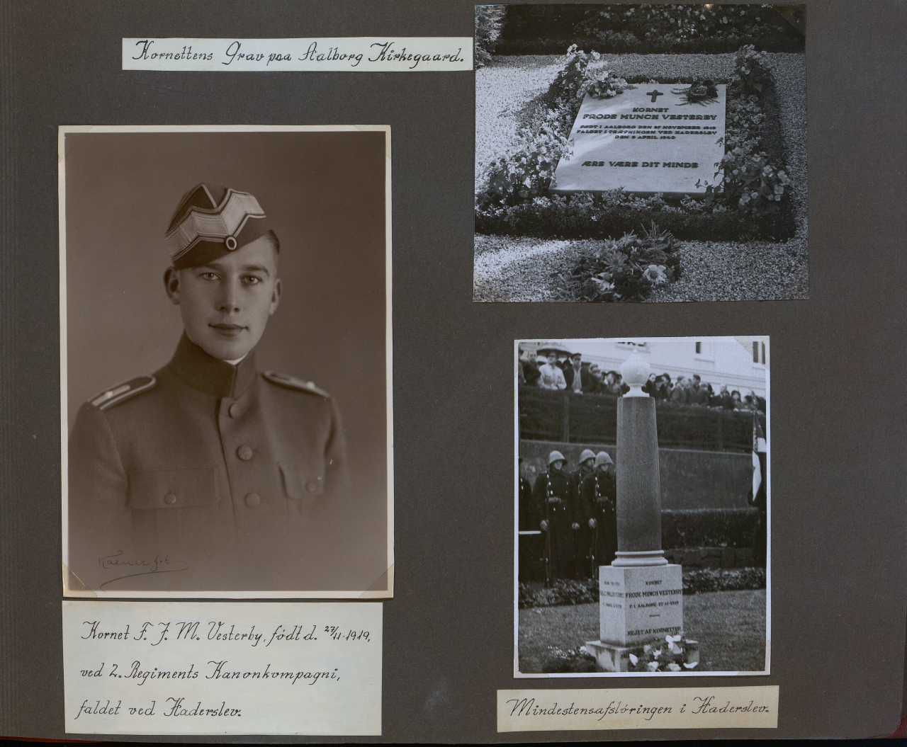 Enkeltside fra mindealbum med 35 sider fotos og tekster omhandlende de faldne fra den 9. april 1940. Viser portrætter, grave, mindesteder, fly, ødelagte våben m.m. Fotos og tekster samlet af major Kølving.