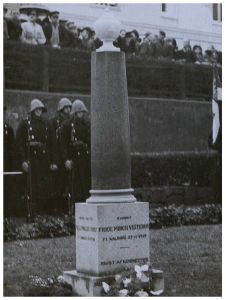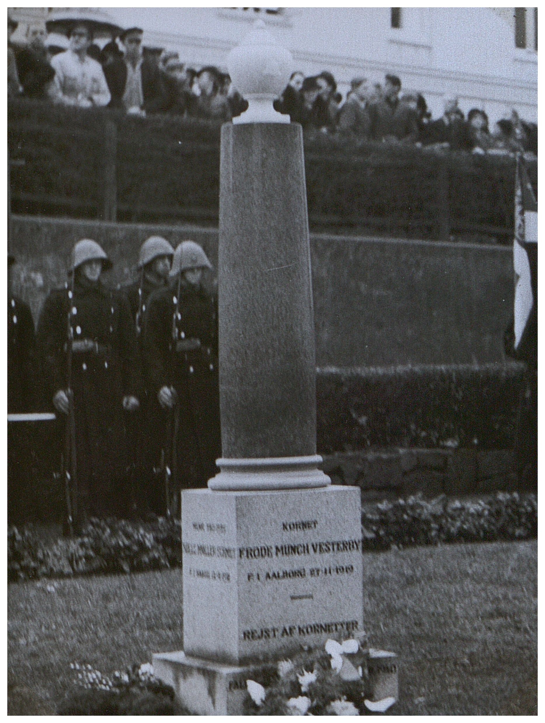 Enkeltside fra mindealbum med 35 sider fotos og tekster omhandlende de faldne fra den 9. april 1940. Viser portrætter, grave, mindesteder, fly, ødelagte våben m.m. Fotos og tekster samlet af major Kølving.