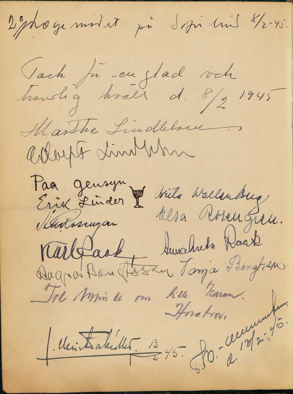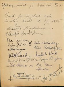 Enkeltside fra gæstebog med 49 siders fotos stammende fra reservelæge Niels Mogens Christiansen, der gjorde tjeneste ved Den danske brigade og kommandoen for militære flygtninge i Sverige, med tjeneststed i militærforlægningen Sofielund. Mest private fotos.