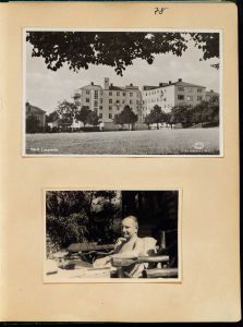 Enkeltside fra gæstebog med 49 siders fotos stammende fra reservelæge Niels Mogens Christiansen, der gjorde tjeneste ved Den danske brigade og kommandoen for militære flygtninge i Sverige, med tjeneststed i militærforlægningen Sofielund. Mest private fotos.