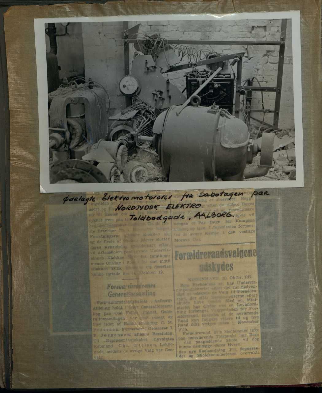 Enkeltside fra kombineret fotoalbum og scrapbog, især vedr. sabotager og Schalburgtager i Aalborg og i mindre grad Odense. Enkelte fotos fra Folkestrejken i KBH,
