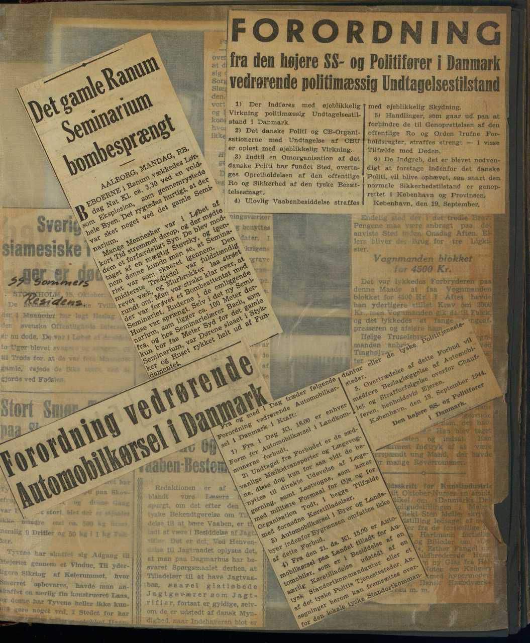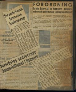 Enkeltside fra kombineret fotoalbum og scrapbog, især vedr. sabotager og Schalburgtager i Aalborg og i mindre grad Odense. Enkelte fotos fra Folkestrejken i KBH,