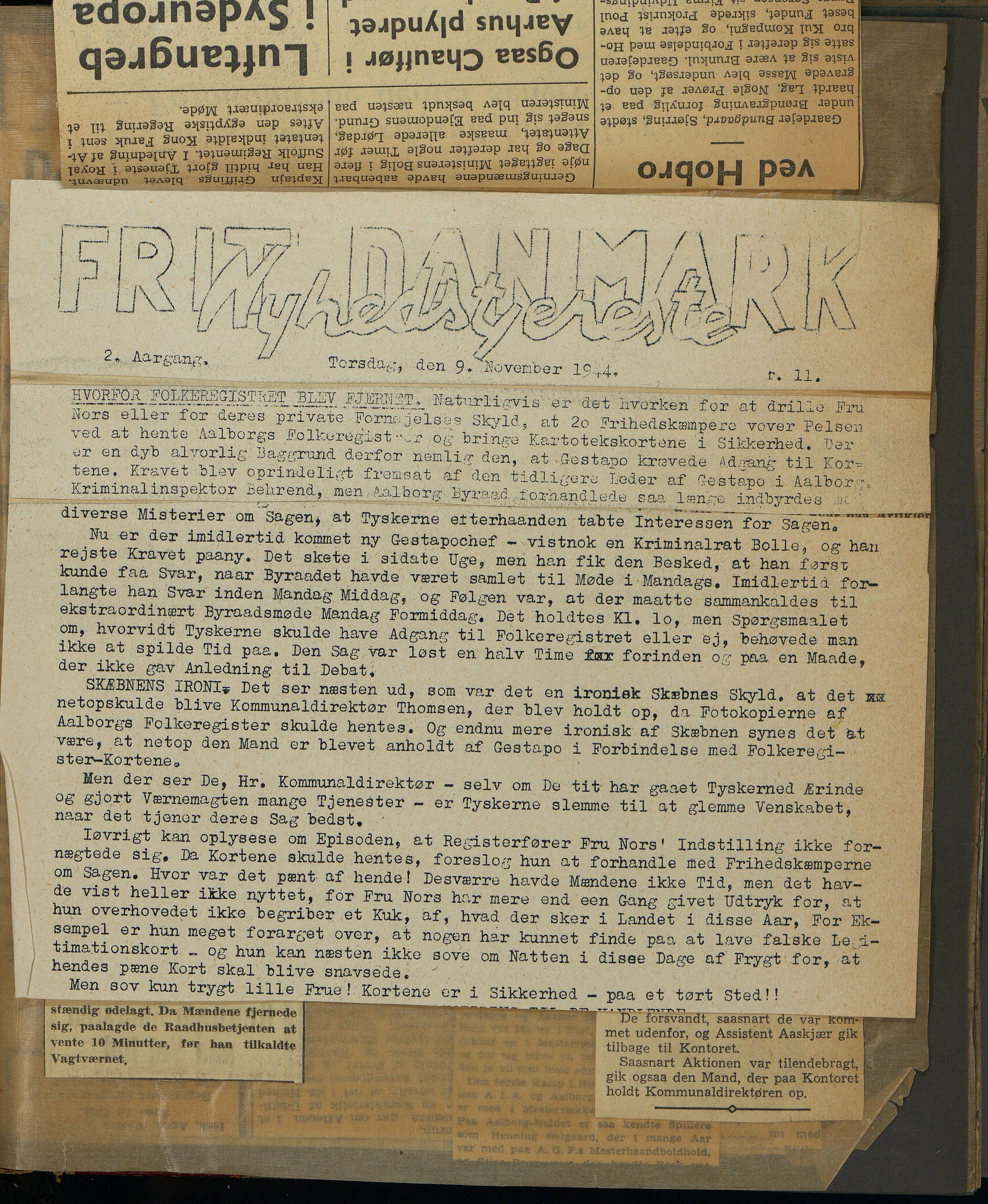 Enkeltside fra kombineret fotoalbum og scrapbog, især vedr. sabotager og Schalburgtager i Aalborg og i mindre grad Odense. Enkelte fotos fra Folkestrejken i KBH,