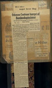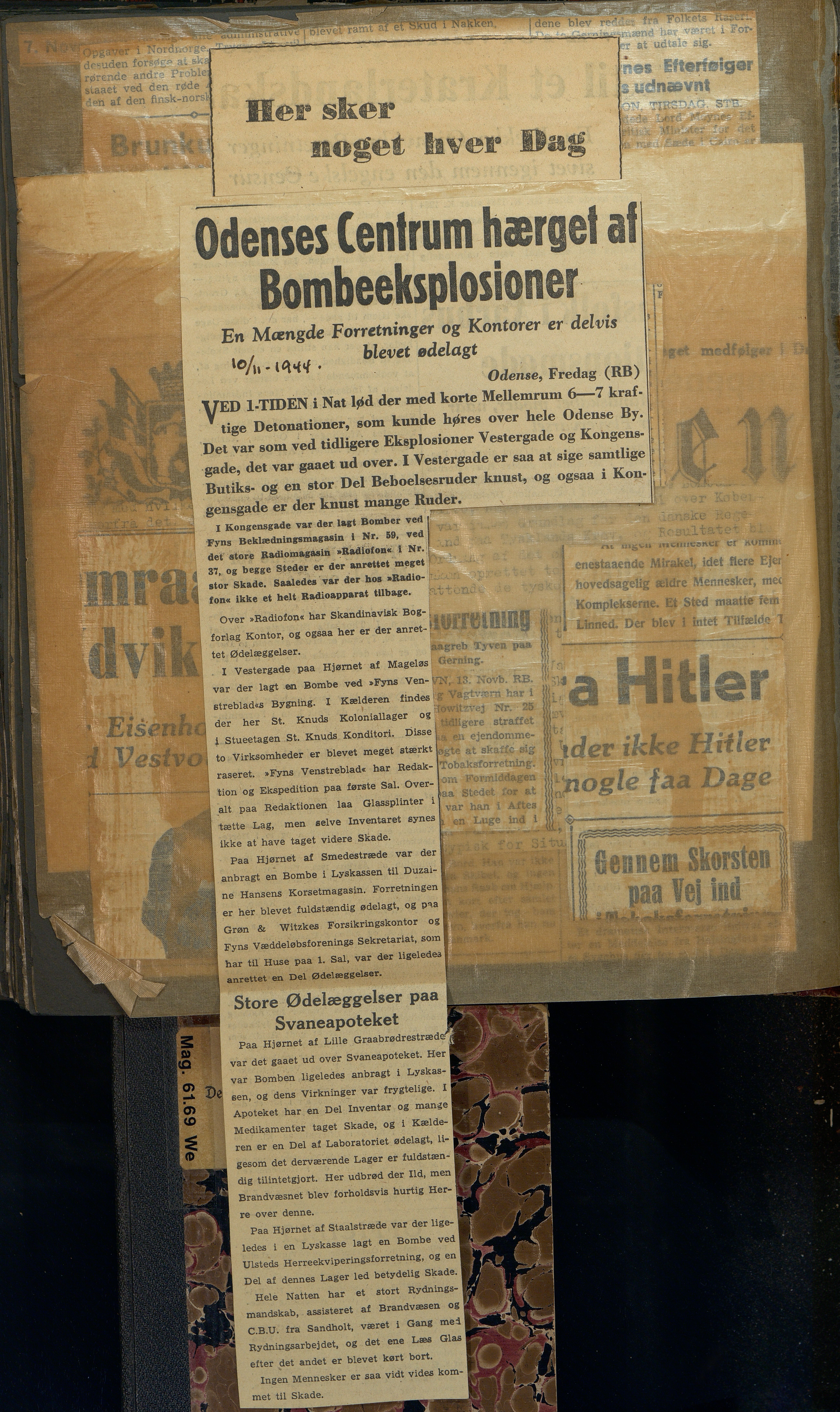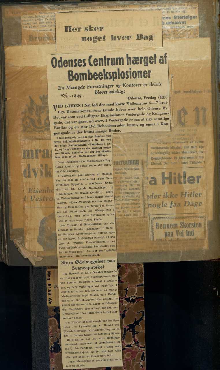 Enkeltside fra kombineret fotoalbum og scrapbog, især vedr. sabotager og Schalburgtager i Aalborg og i mindre grad Odense. Enkelte fotos fra Folkestrejken i KBH,