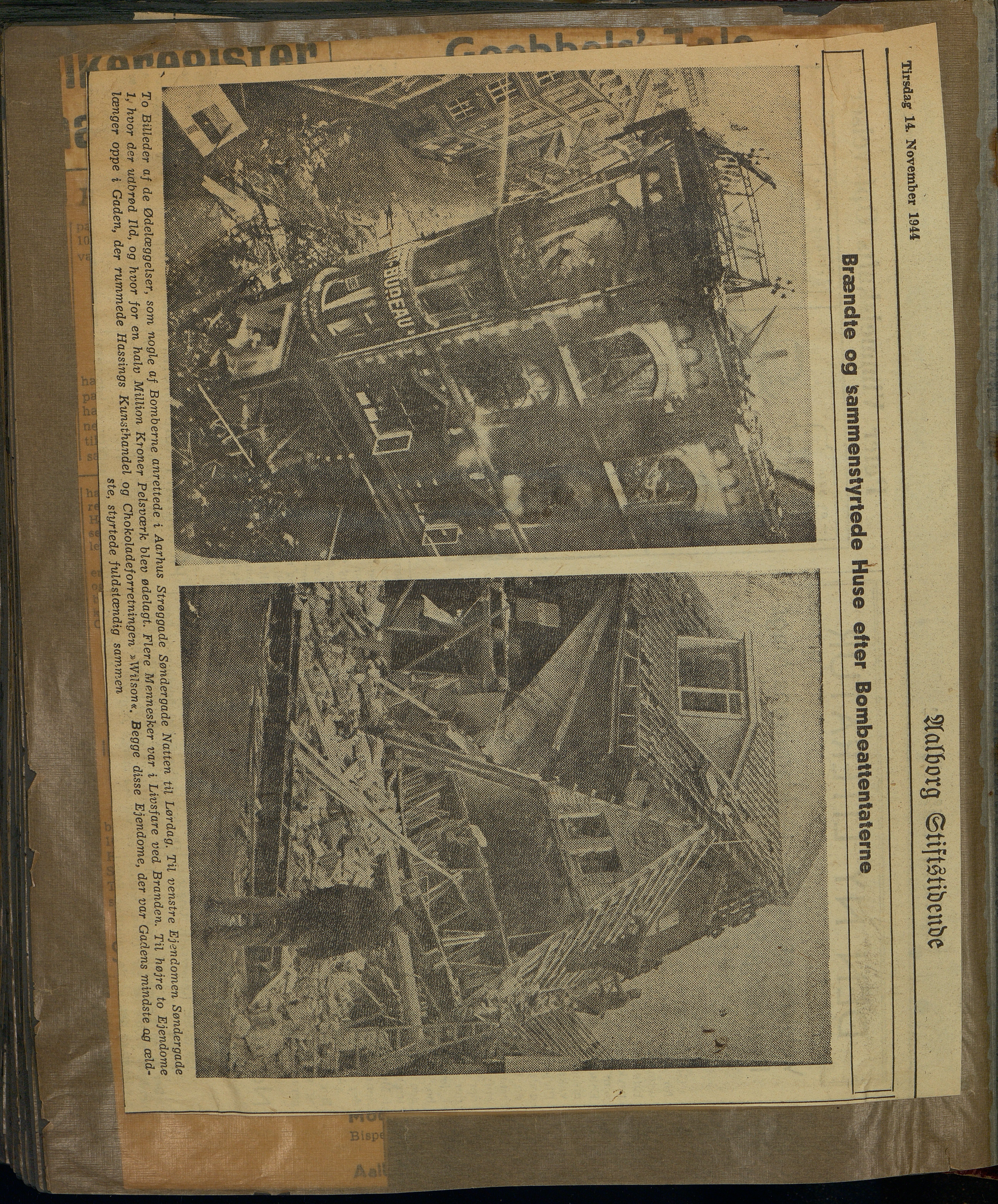 Enkeltside fra kombineret fotoalbum og scrapbog, især vedr. sabotager og Schalburgtager i Aalborg og i mindre grad Odense. Enkelte fotos fra Folkestrejken i KBH,