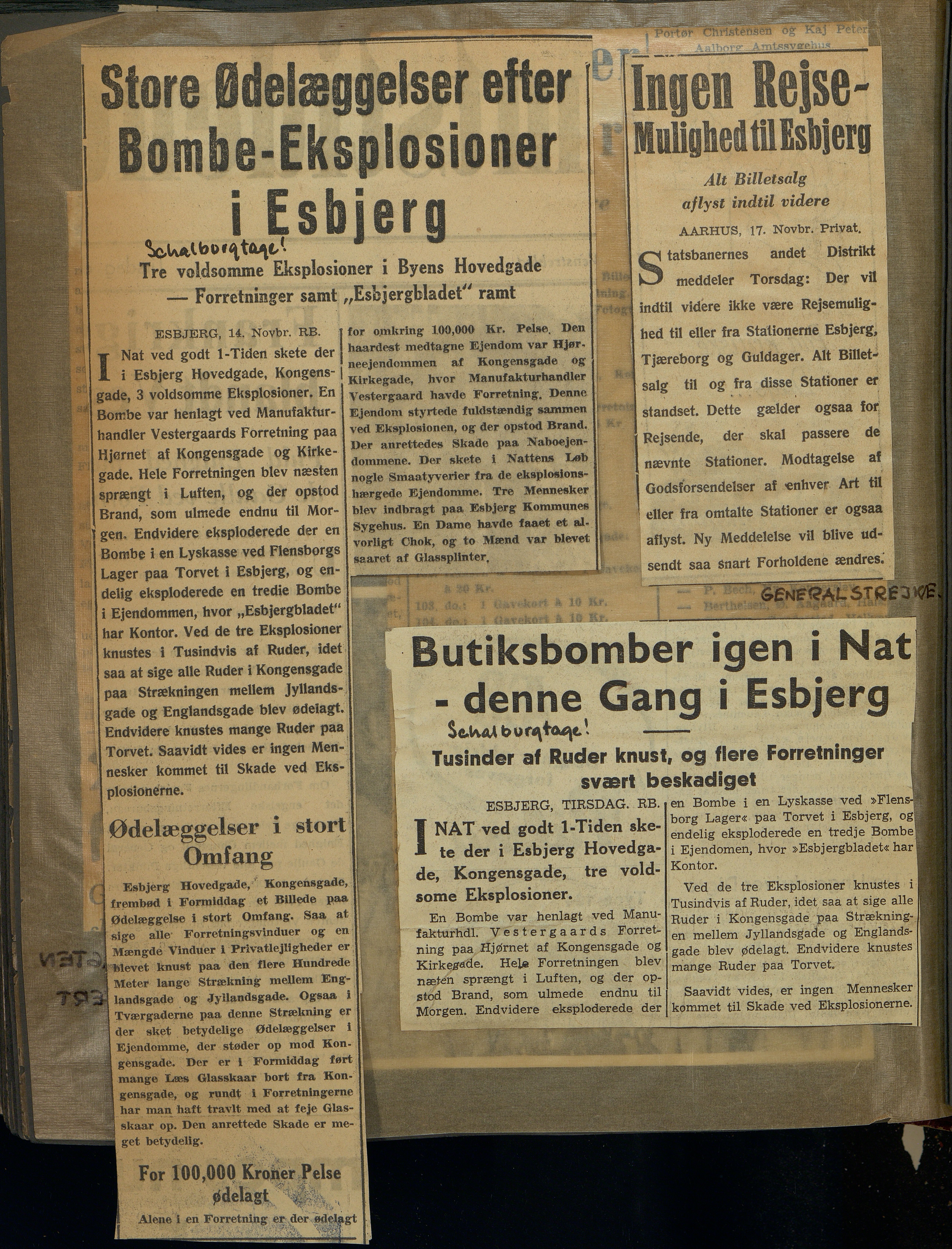 Enkeltside fra kombineret fotoalbum og scrapbog, især vedr. sabotager og Schalburgtager i Aalborg og i mindre grad Odense. Enkelte fotos fra Folkestrejken i KBH,