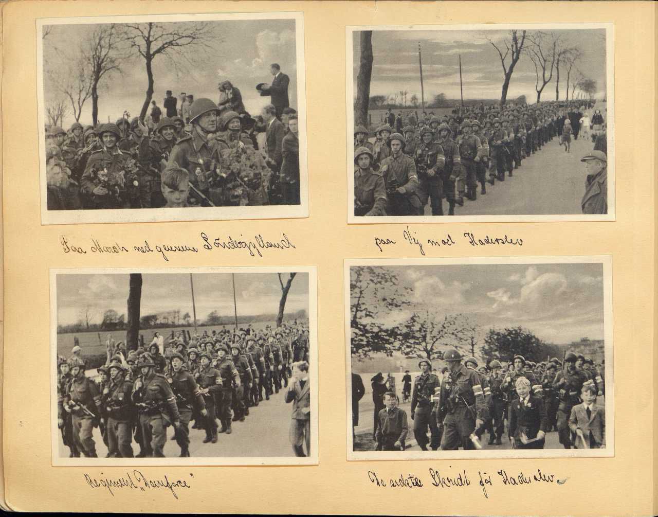 Enkeltside fra mindealbum fra Den danske Brigade med ikke-originale fotos. Pålimet telegram på indersiden af albummet fra P. Bosse til giveren.