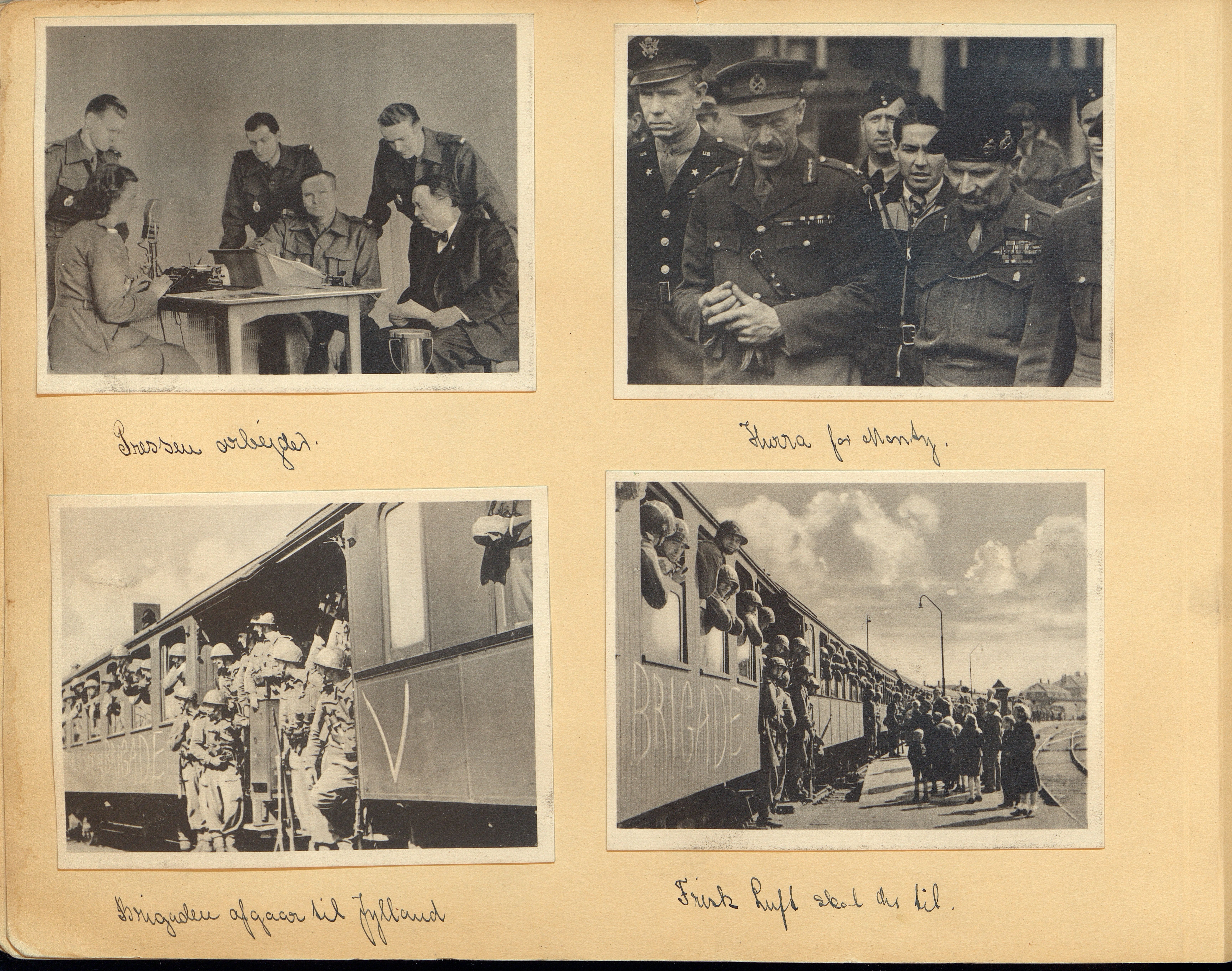 Enkeltside fra mindealbum fra Den danske Brigade med ikke-originale fotos. Pålimet telegram på indersiden af albummet fra P. Bosse til giveren.