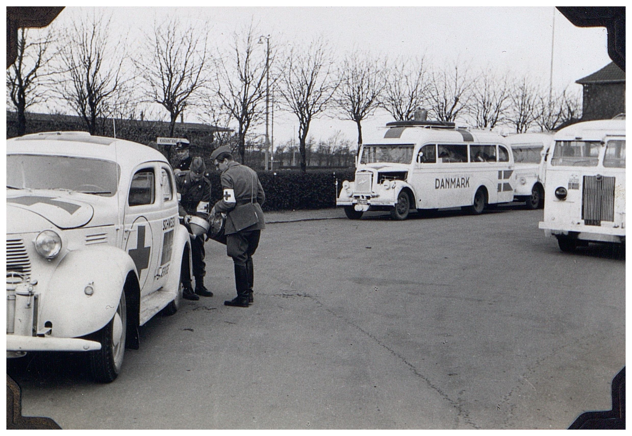 Enkeltfoto fra fotoalbum med fotos fra hjemtransporten af kz-fanger med de hvide busser, samt karantænelejren i Padborg. Dertil fotos fra Storebæltsfærgen og fra Frihavnen i Kbh. Mange fotos af Grev Bernadotte.