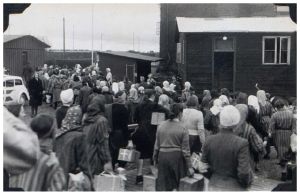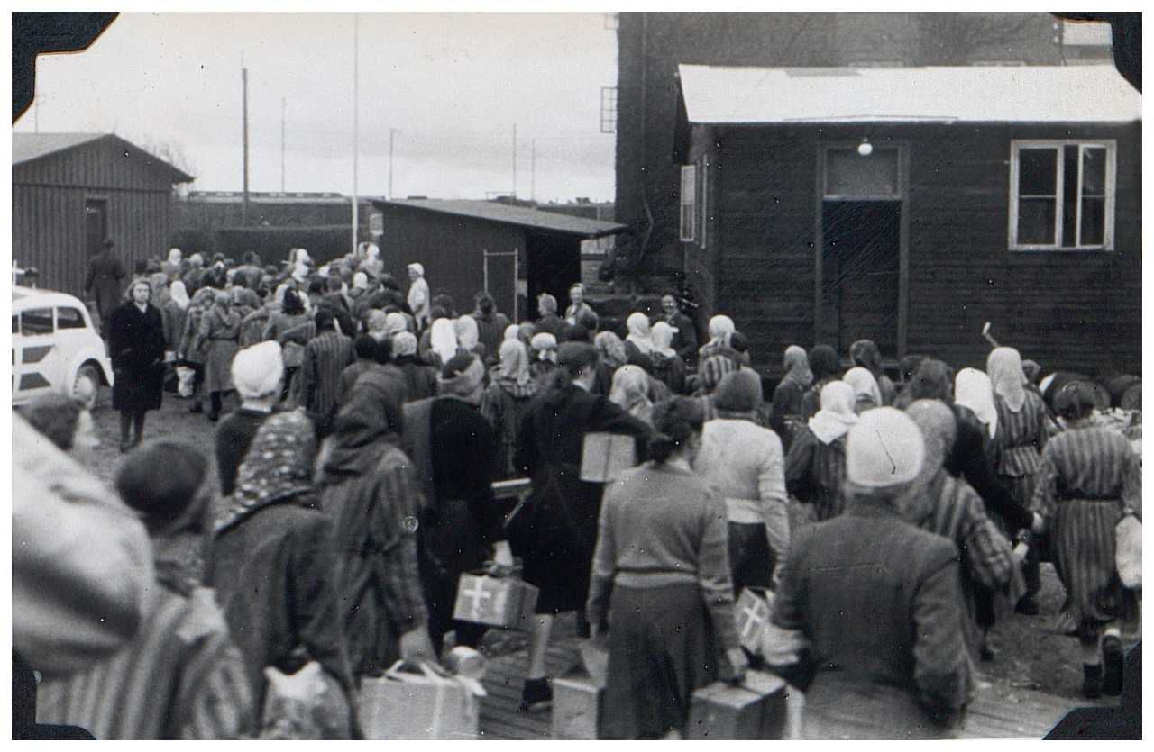 Enkeltfoto fra fotoalbum med fotos fra hjemtransporten af kz-fanger med de hvide busser, samt karantænelejren i Padborg. Dertil fotos fra Storebæltsfærgen og fra Frihavnen i Kbh. Mange fotos af Grev Bernadotte.