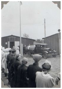 Enkeltfoto fra fotoalbum med fotos fra hjemtransporten af kz-fanger med de hvide busser, samt karantænelejren i Padborg. Dertil fotos fra Storebæltsfærgen og fra Frihavnen i Kbh. Mange fotos af Grev Bernadotte.