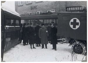 Enkeltfoto fra fotoalbum med fotos fra hjemtransporten af kz-fanger med de hvide busser, samt karantænelejren i Padborg. Dertil fotos fra Storebæltsfærgen og fra Frihavnen i Kbh. Mange fotos af Grev Bernadotte.