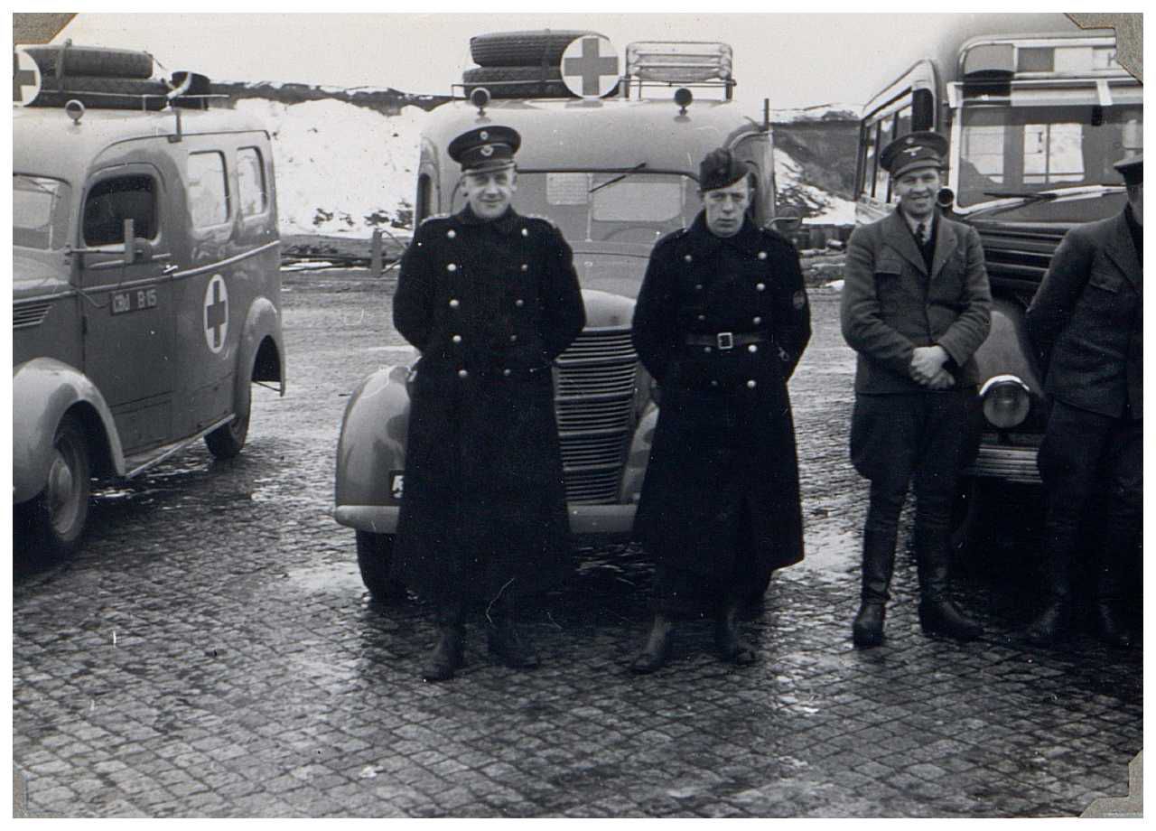 Enkeltfoto fra fotoalbum med fotos fra hjemtransporten af kz-fanger med de hvide busser, samt karantænelejren i Padborg. Dertil fotos fra Storebæltsfærgen og fra Frihavnen i Kbh. Mange fotos af Grev Bernadotte.