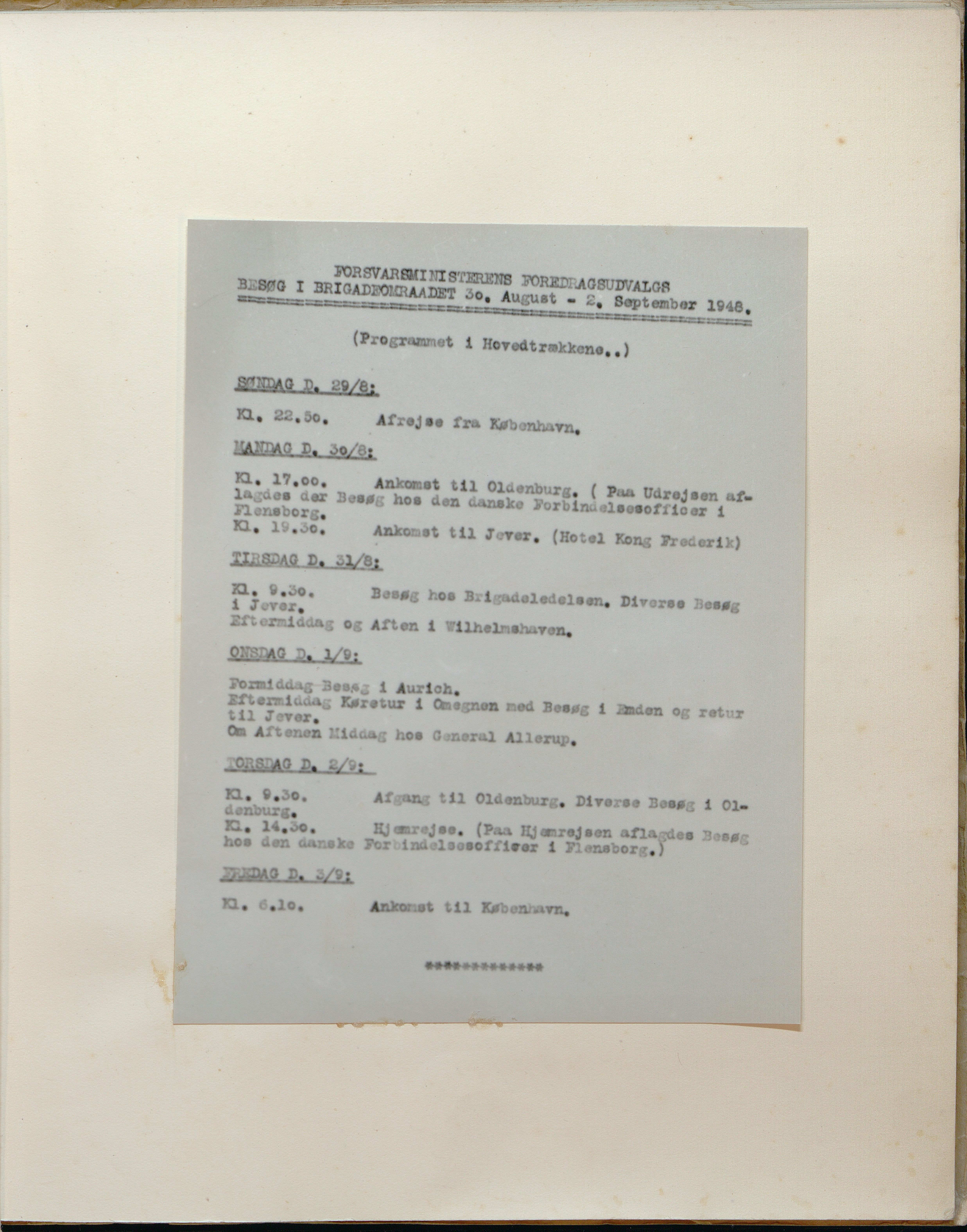 Enkeltside fra album med fotos fra Forsvarsministeriets foredragsudvalgs besøg i Den danske Tysklandsbrigades område i Tysland den 30.08. - 02.09.1948.