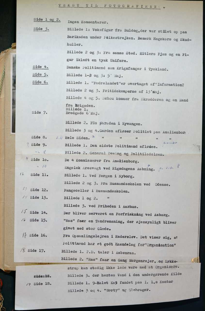 Enkeltside fra album med titlen "Minder fra tiden omkring kapitulationen". Relaterer sig hovedsagligt til politiet omkring befrielsesdagene, herunder politiets illegale ledelse. Enkelt gruppefoto af politifolk i tysk fangenskab, samt fotos af britiske styrker.