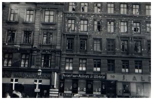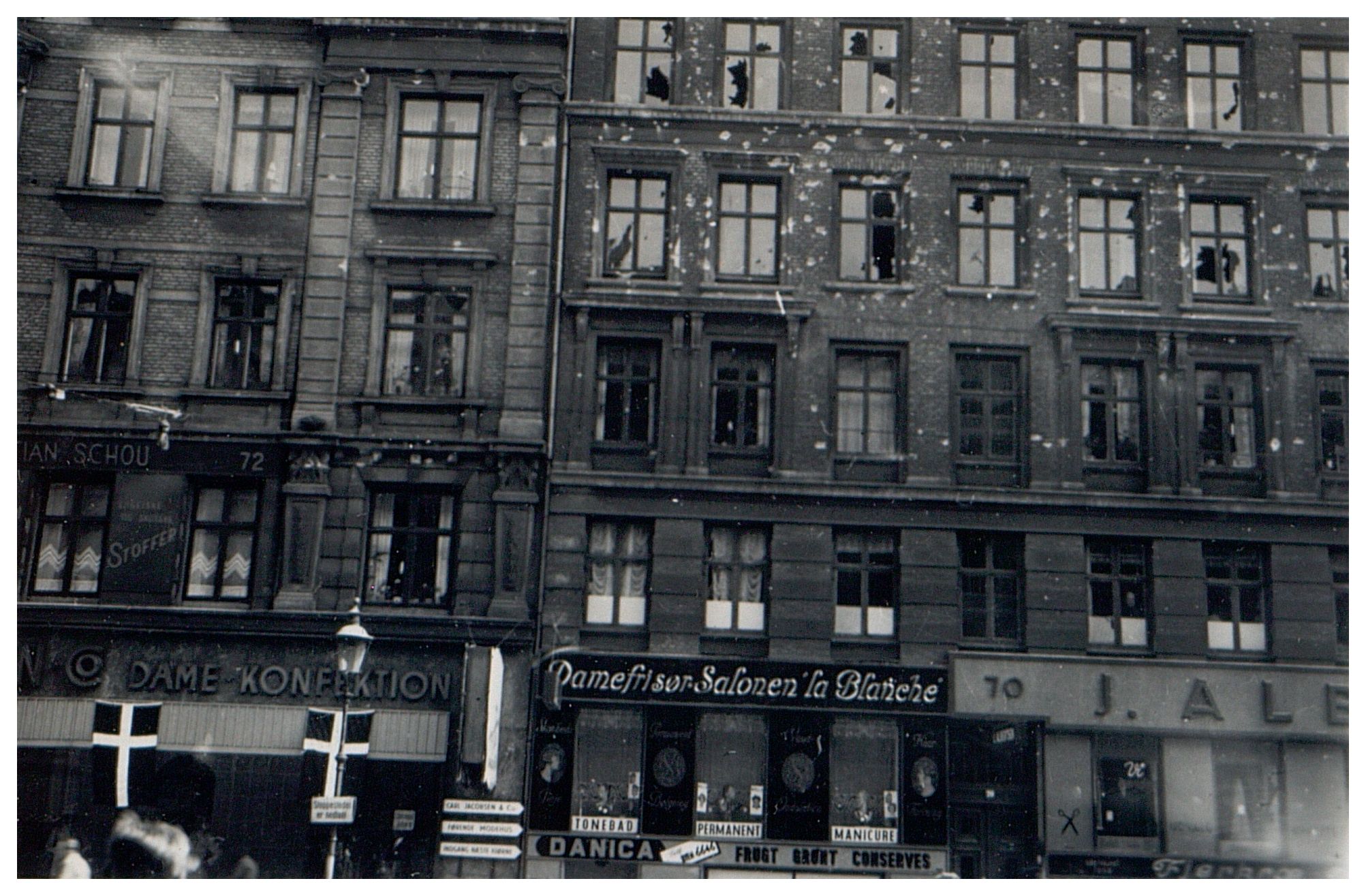 Enkeltfoto fra album med diverse købte serie-fotos fra besættelsen, med udklippede tekster.