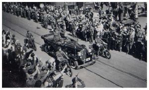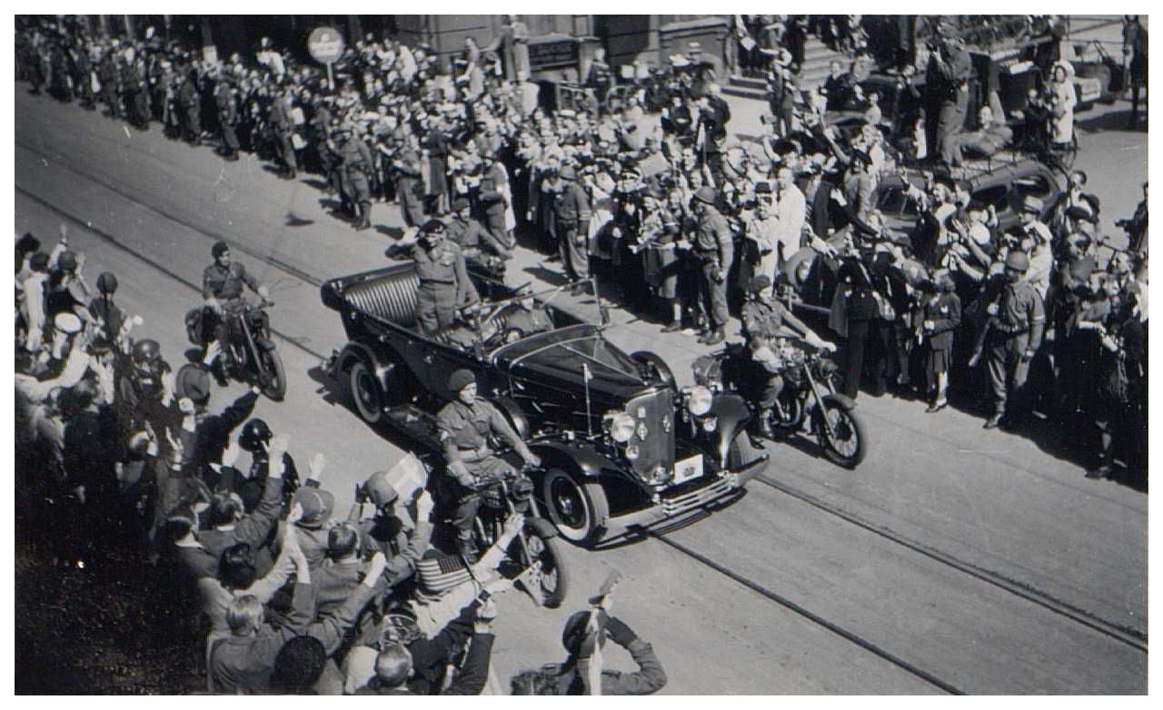 Enkeltfoto fra album med diverse købte serie-fotos fra besættelsen, med udklippede tekster.