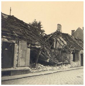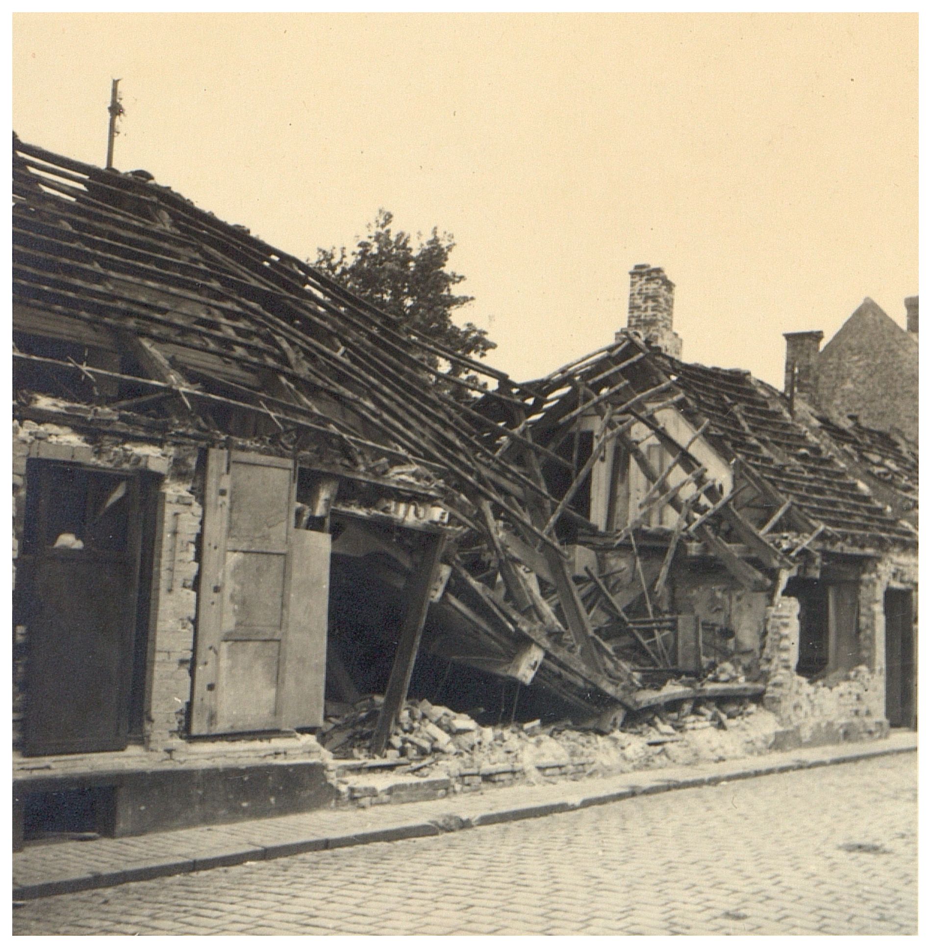 Enkeltfoto fra album med fotos af Bornholm og bombeskaderne fra russernes bombardementer. Indlagte kort over Rønne og Nexø med markeringer af bombenedslag. Fremstillet af Bornholms Amt og givet til socialminister S.P. Larsen den 24.11.1945.