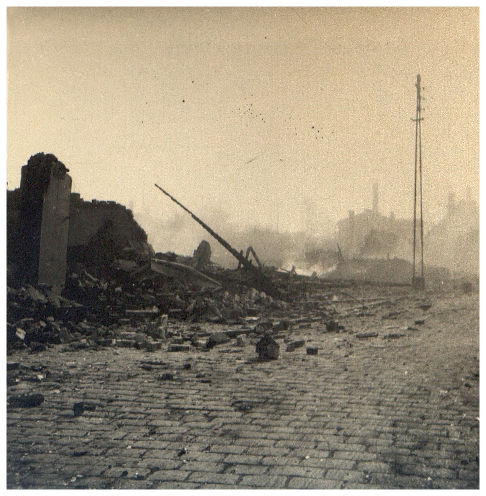 Enkeltfoto fra album med fotos af Bornholm og bombeskaderne fra russernes bombardementer. Indlagte kort over Rønne og Nexø med markeringer af bombenedslag. Fremstillet af Bornholms Amt og givet til socialminister S.P. Larsen den 24.11.1945.
