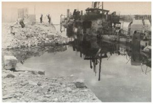 Enkeltfoto fra album med fotos af Bornholm og bombeskaderne fra russernes bombardementer. Indlagte kort over Rønne og Nexø med markeringer af bombenedslag. Fremstillet af Bornholms Amt og givet til socialminister S.P. Larsen den 24.11.1945.
